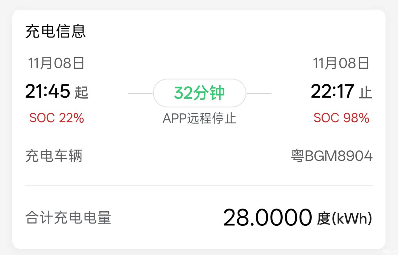 用快充最高能到100kw以上,有一次22%-98%用了32分钟,如果充到80%左右只需要二十来分钟,速度还是很满意的。
