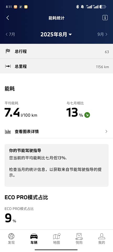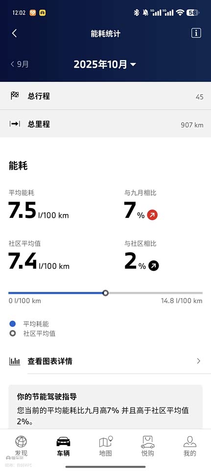 1.表现中规中矩。市区通勤堵车时,百公里油耗约9个;走环线不堵能降到7个多。比同级别日系车高,但作为BBA燃油车,这个油耗能接受——就是堵车看油表往下掉,还是会心疼点。 2.在10月总里程跑了907km,平均能耗7.5L/100km,本人还是学生,所以平时跑的不太多,就拿城市道路来说,有时走早晚高峰难免堵车,走走停停的情况下这个能耗我觉得还算可以接受;但是若是经常跑堵车路况的话应该还要高很多,要是跑高速,保持匀速行驶的话,能耗其实能更低一些。不过对比社区平均值我还高了2%,接下来打算试试更平缓的加速和提前预判路况减少刹车,看看能不能把能耗再降一降,这样在补能费用上也能更省些。