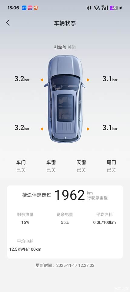 现在天冷了,纯电续航有点低吧。现在应该能跑个150 160吧纯电。天热了应该会好一点。 跑了一趟高速,油耗我发几张图吧,广大车友自己参考吧
