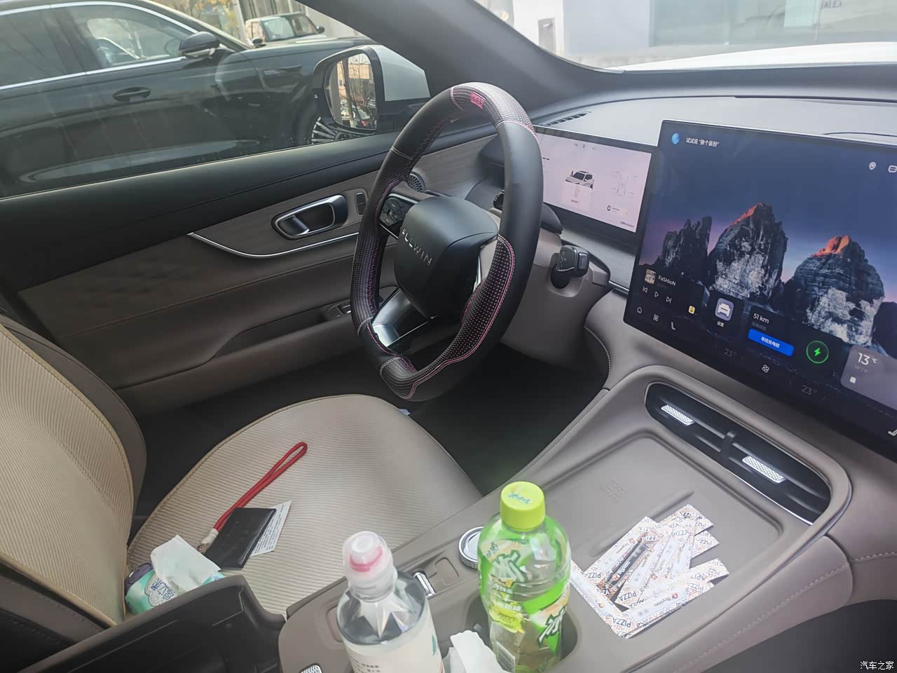 内饰棕色仿皮质感不错,摸着手软,中控台也是软性材质,看着不廉价。15.6英寸中控屏够大,操作流畅不卡顿,空调、听歌用语音控制就行,开车时不用手动调,安全又省心,新车味不算重,通风几天就散得差不多了。