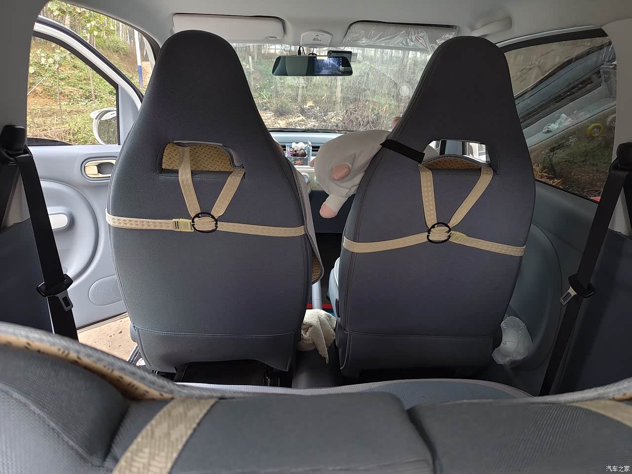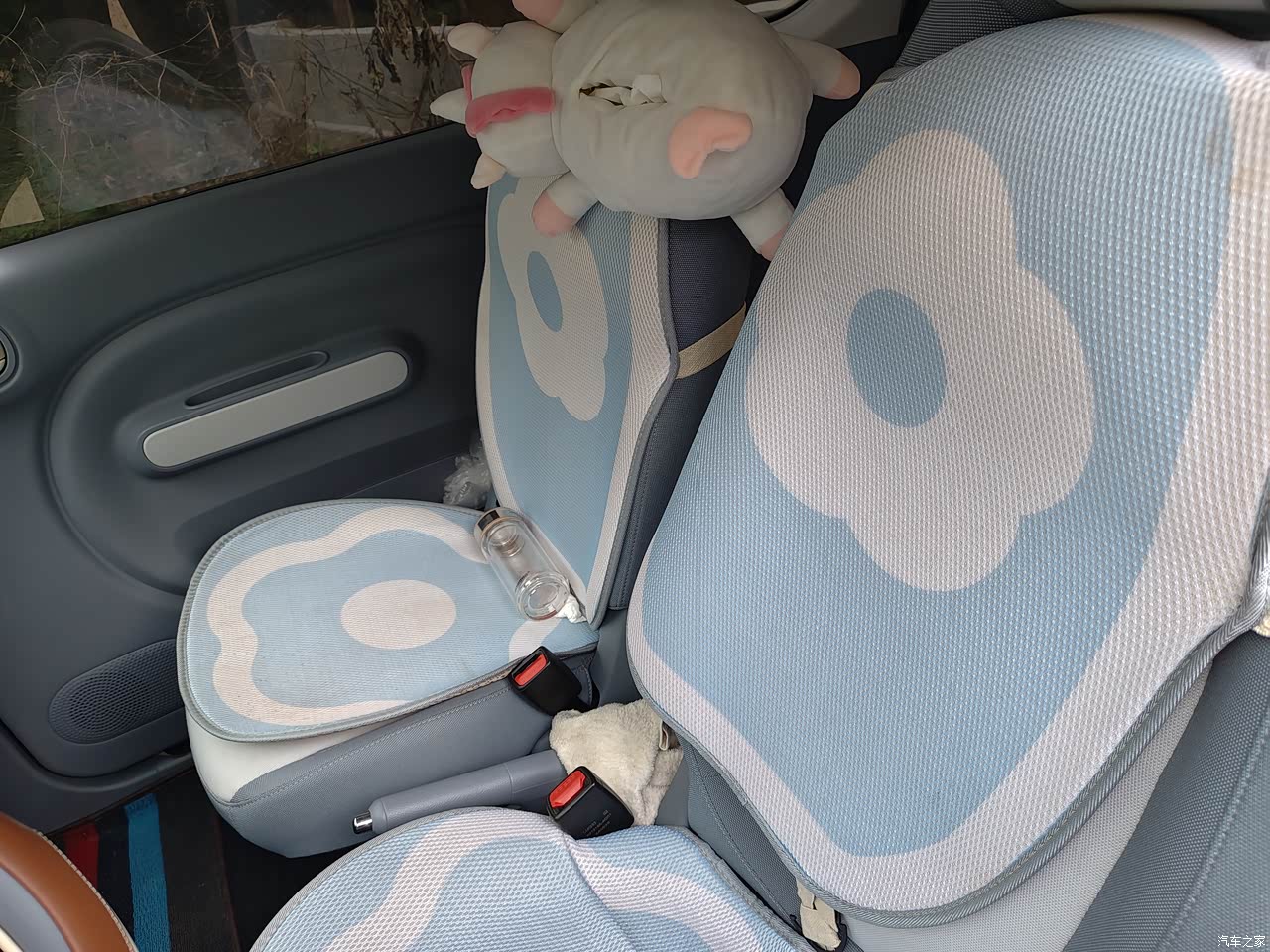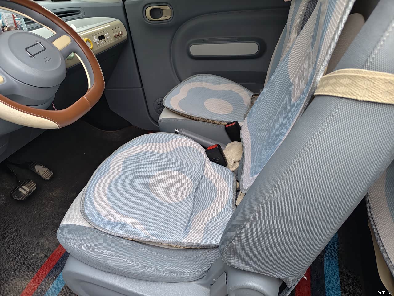 内饰完全延续了外观的可爱治愈风,还藏着不少实用小细节。中控台设计得简洁清爽,没有花里胡哨的多余按键,各项功能分区清晰,上手特别快,我爸妈偶尔开我的车都能轻松操作。虽然车内主要是硬塑料材质,但做工很细腻,边缘都做了圆润处理,搭配车门板上的浅色系织物点缀,温馨感一下就拉满了。