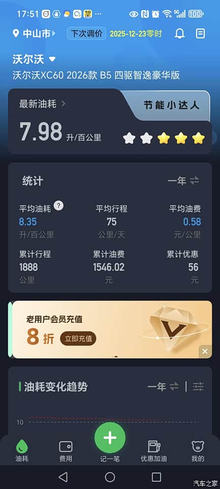 因为只加了第二箱油,从开始的油耗12,到9,后来稳定到8点几,我几乎都是用的手动模式,准备加完五箱油都用手动模式驾驶。然后再试两箱油用D档模式,人工记录油耗来对比。到时我再发贴分享给大家,对比看看怎么使用更油。不过,根据我的驾驶习惯,就不是那种最惜油的驾驶员。