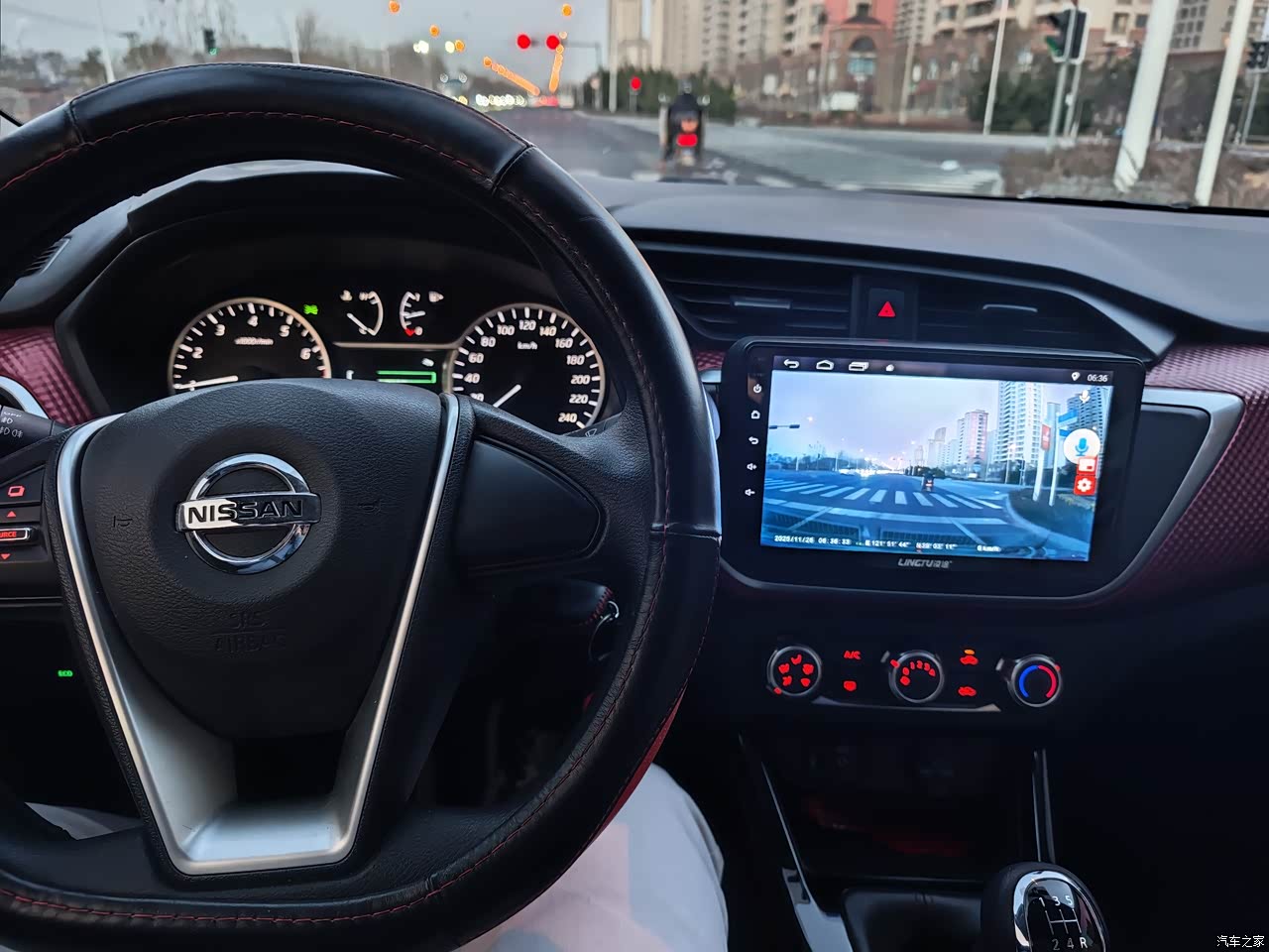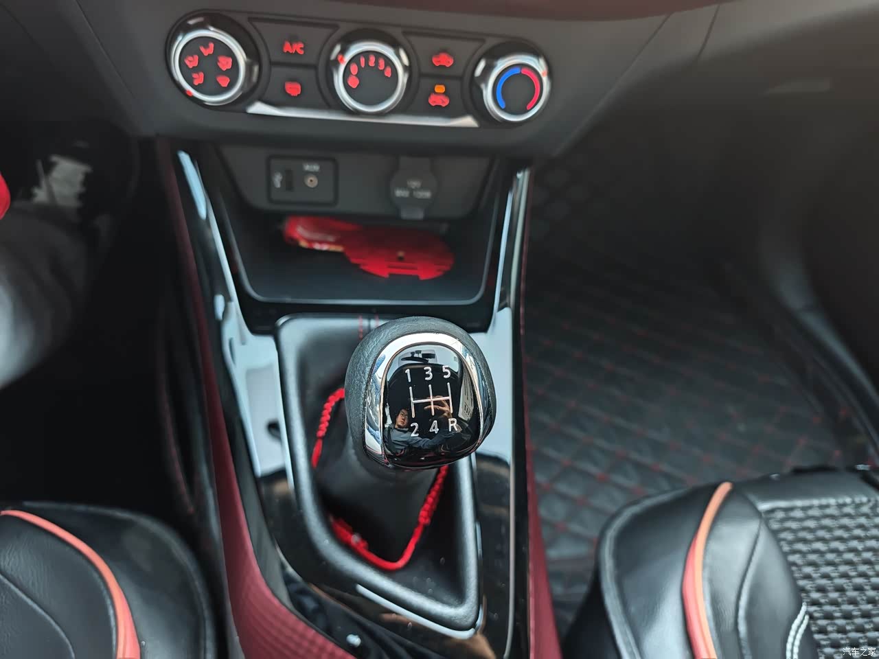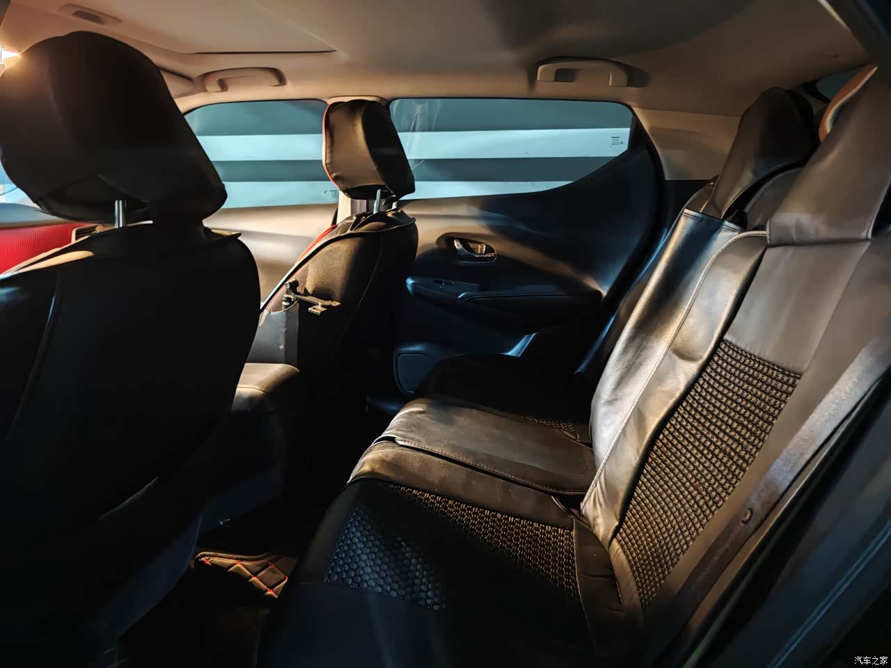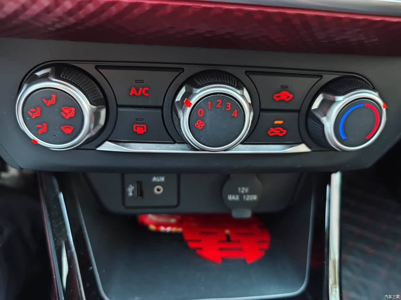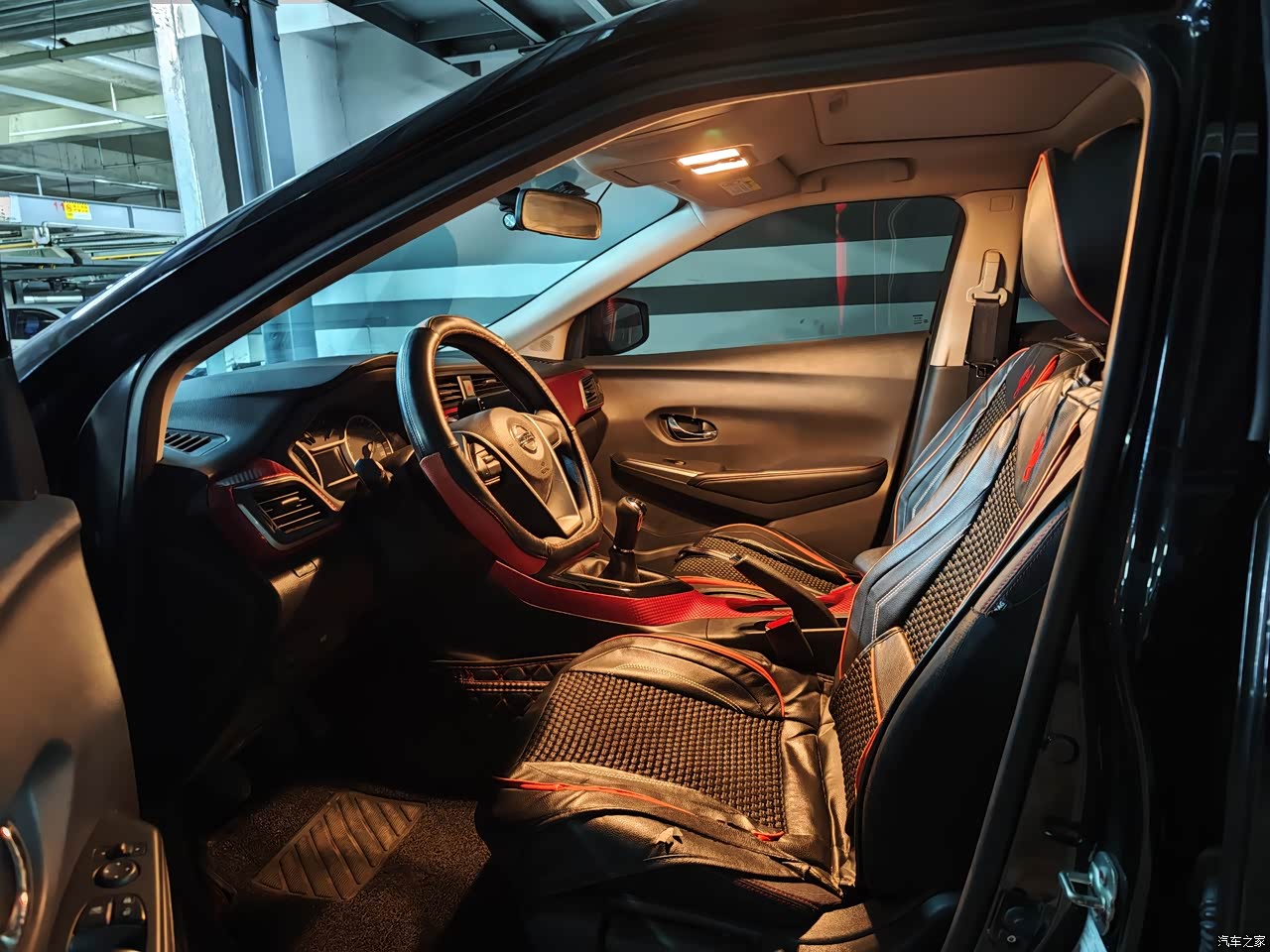 整车内饰大部分是塑料的,主要黑色和红色搭配,有部分位置是皮包的,但只是少部分,空调是按键和旋钮操控的,我觉得很实用,不用看就能操作。方向盘是塑料的,手感一般,自己在网上买了个方向盘套安装上了,后期考虑缝一个方向盘套,手感能更好一些。方向盘按键只有一个,能查看小计里程和剩余油量续航。座椅是织布的,舒适透气,夏天不烫,我本来是不想加座套的,但老婆说加座套脏了好打理,防止打翻果汁饮料什么的,考虑到家庭和谐还是遵从老婆的意见。