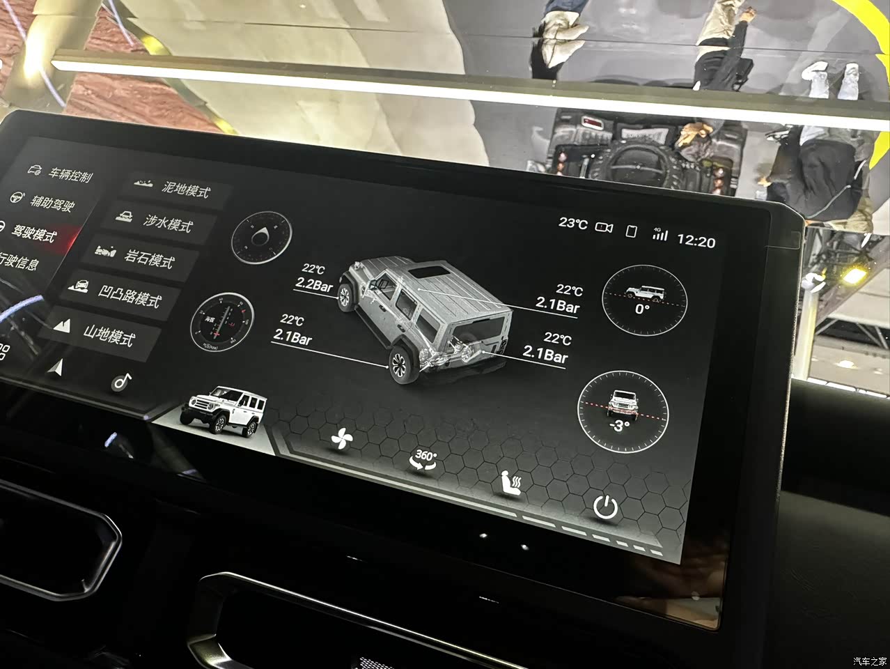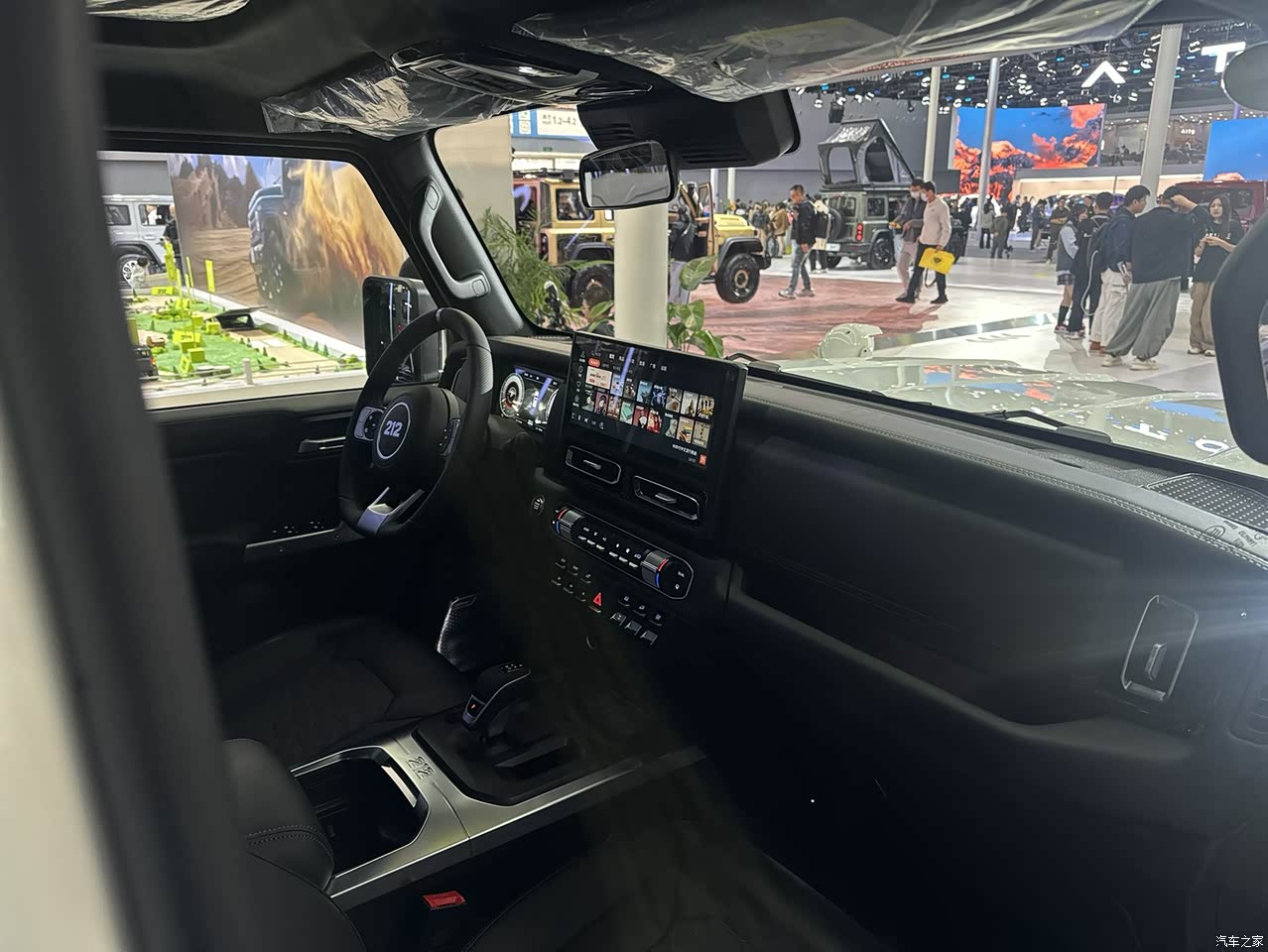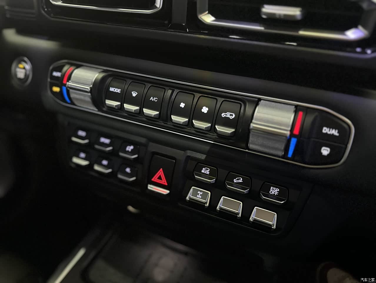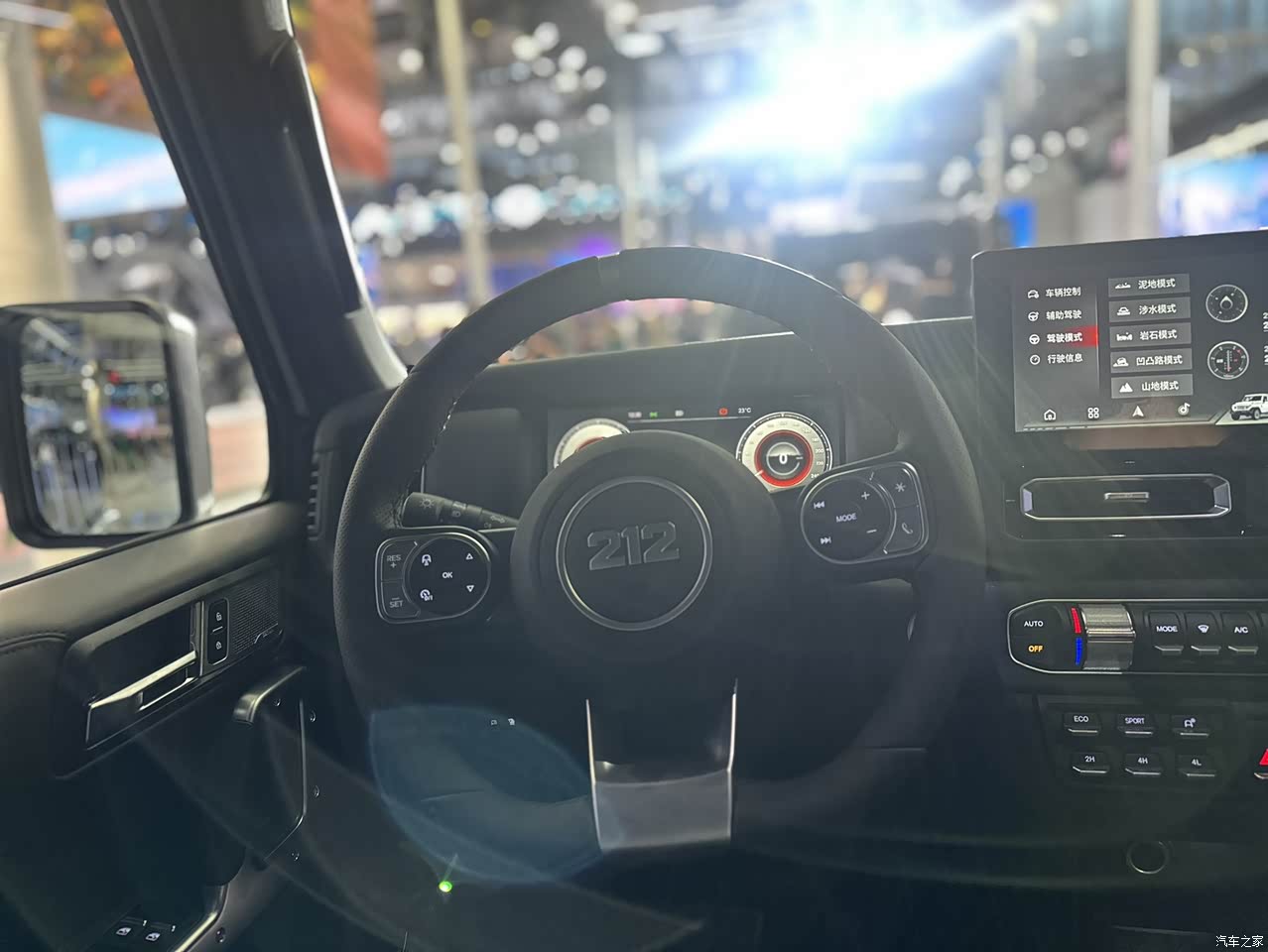 内饰设计还是很给力的,延续了硬派SUV该有的设计风格,整体很硬朗。而且整车尽可能保留了物理按键,像中控屏下方就有很大一块物理按键区域,包含空调控制区、越野功能控制区等,在颠簸路面行驶时使用实体按键盲操作我感觉比用语音助手更好一点,效率更高。不过在科技配置方面,212 T01也是跟上了时代,像大尺寸的液晶仪表盘、中控屏幕、电子手刹、360全景影像等都是配上了的,主打一个外刚内柔