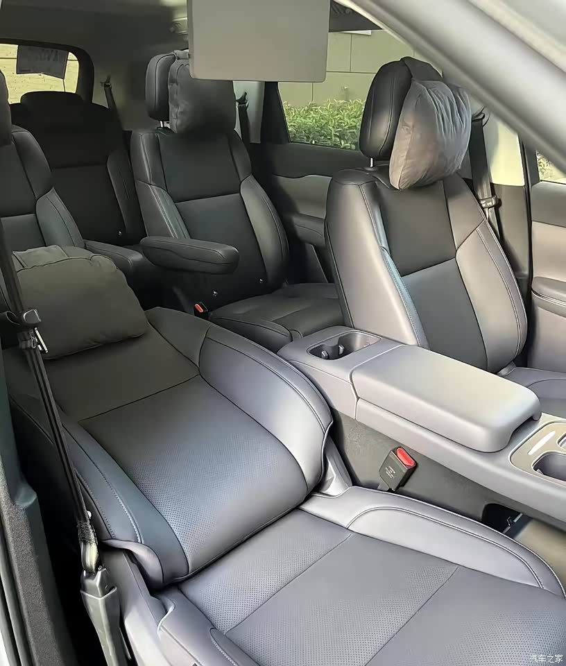二排座椅能前后移动12cm,靠背可调节至155度半躺,我妈每次长途都调至120度左右小憩,醒了总说“比家里沙发还舒服,腰不酸”。我172cm坐第三排,膝盖离二排座椅还有一拳距离,平地板设计不用蜷腿,车顶凹槽设计让头部也不压抑,完全不会有“挤在角落里”的感觉。储物空间藏满巧思,全车25处储物格超实用:门板能放两瓶1.5L矿泉水,副驾储物盒能装下孩子的绘本和零食,二排中央扶手的5L储物格适合放折叠伞、水杯,零碎物件各归其位,车内始终整洁有序。