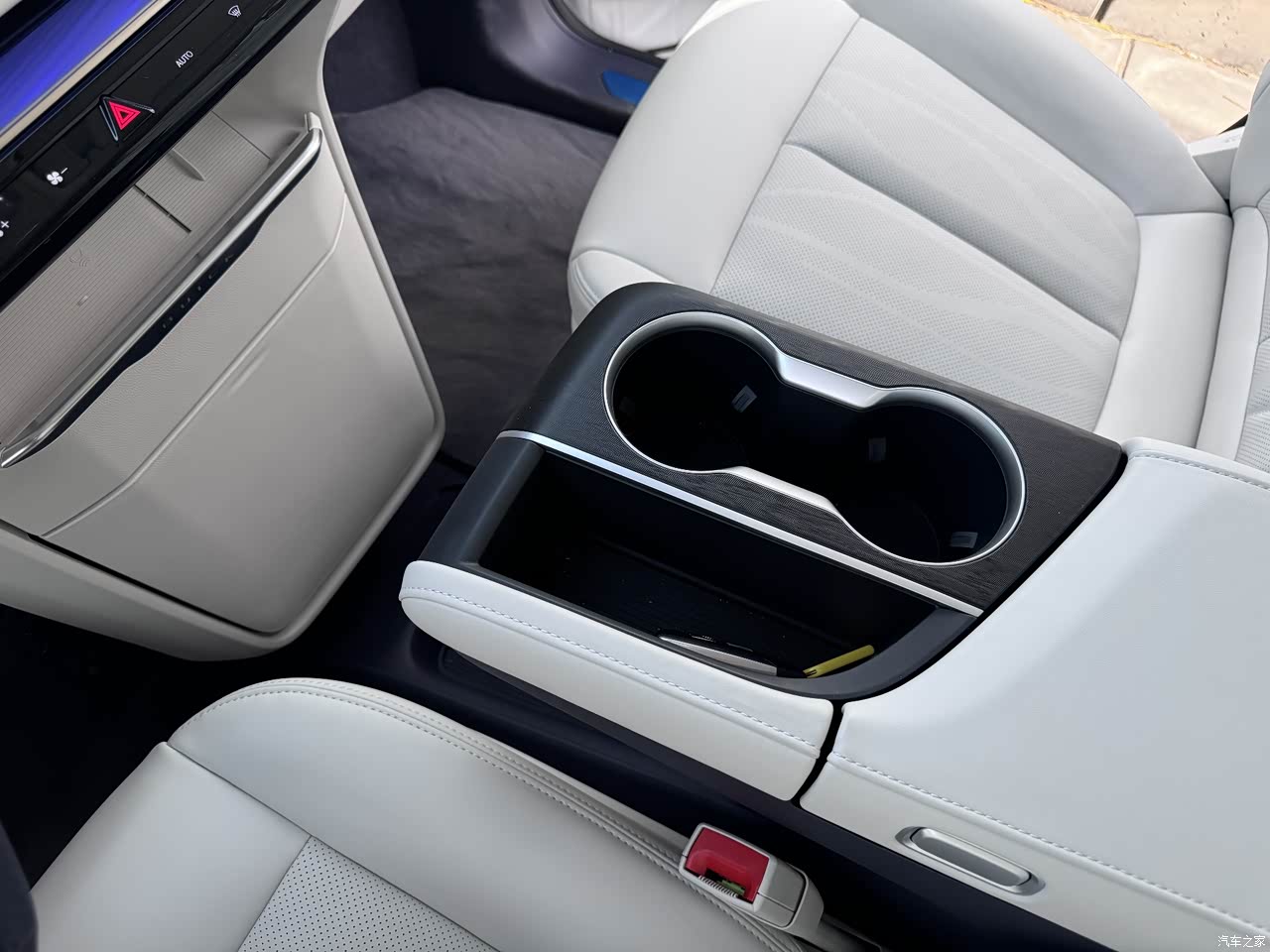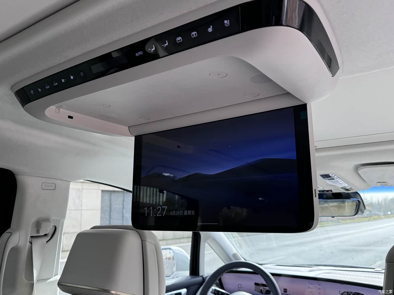 内饰是霞紫月白配色,看着特别清爽,吸顶电视质感拉满,座椅摸着手感细腻。细节做工也到位,缝线整齐,没什么塑料感。128色氛围灯晚上开着挺有感觉,很有格调,就是浅色内饰容易脏,得经常打理。