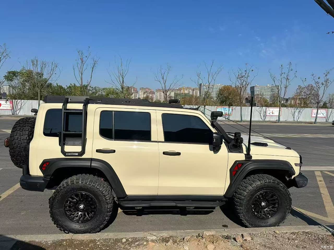 外观是真霸气,沙丘米色车身配方形大灯,改了AT胎,活妥妥小方盒子比大G都帅,开出颜值迷倒一片。后挂备胎、粗犷的轮眉,往那一站就有硬派那味,完全长在我审美上。