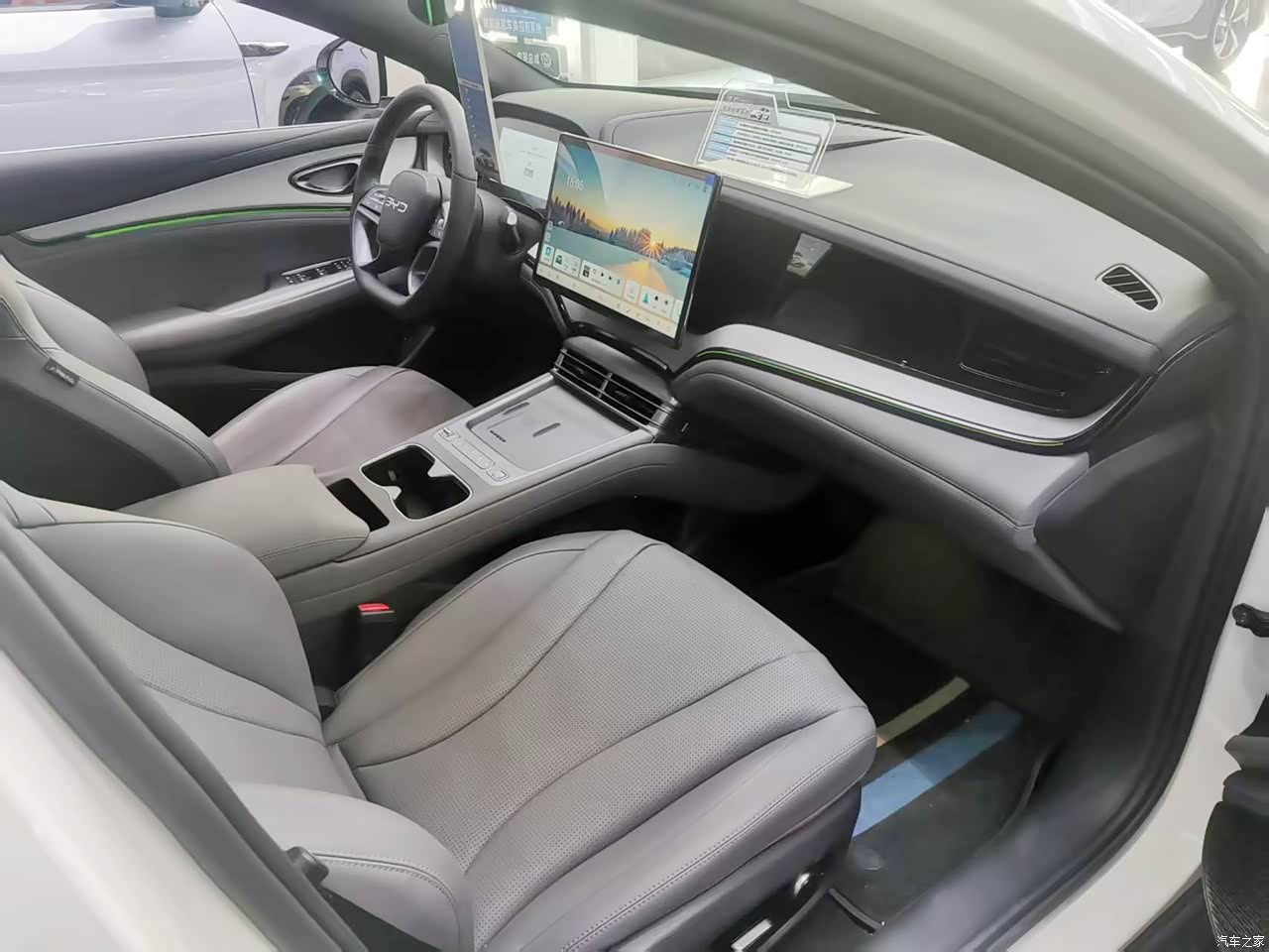 开门,座舱气质先扑面过来,环抱感做出来了,层次流畅,手摸是软包,看见是整齐缝线,触觉视觉都在线,中控有悬浮屏,还能旋转,电子换挡干净利落,功能区不乱,语音叫一声,车机就跟上,氛围灯贯穿一圈,亮度不刺眼,海浪纹理饰板在旁边呼应,光影有律动,有点格调,一体式座椅贴合,承托稳,通风加热都给到,长途更轻松,后排空间宽,腿脚不顶,出风口独立吹,充电口就手,接着看采光,全景天幕一顶,车里更通透,白天舒服,夜里也有味道,NVH做了优化,双层静音玻璃看配置来,路噪风噪压下去不少,储物也有巧思,前后都能放,手机丢到无线充电板,边走边充,中央扶手宽,靠着不累,日常东西都有安置位,说到底,海豹07 DM-i外观有力量,内饰有温度,年轻人看脸,实用党看体验,这台车两边都顾到一点,不过你更看重哪一面,动感还是秩序,科技还是质感。