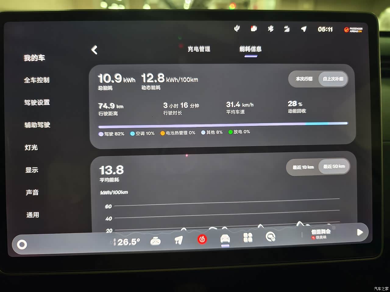 电耗表现也很亮眼,日常通勤综合电耗13kWh/100km左右,春秋天会更低一些,满电状态下实际续航能春秋到350km,冬天280km,有家充桩的话,一周充一次完全够用 。