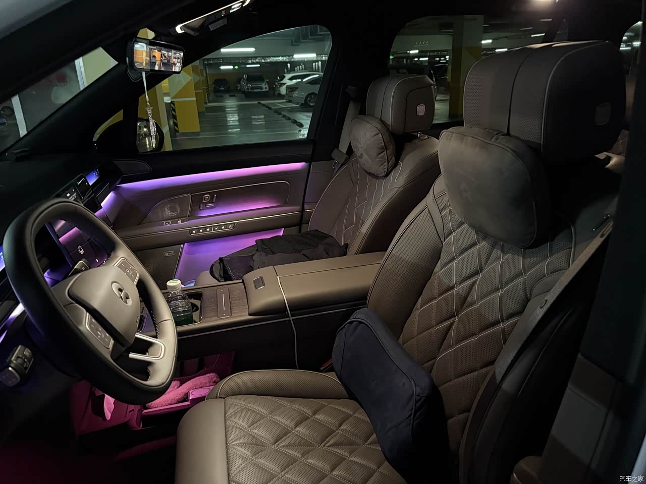 内饰用料还是比较讲究的,高级而且颜色非常吸引我,氛围灯一打开,晚上的氛围感直接拉满,太有氛围了。新车基本没异味,而且空调的效果很棒还有净化功能,确实很不错。