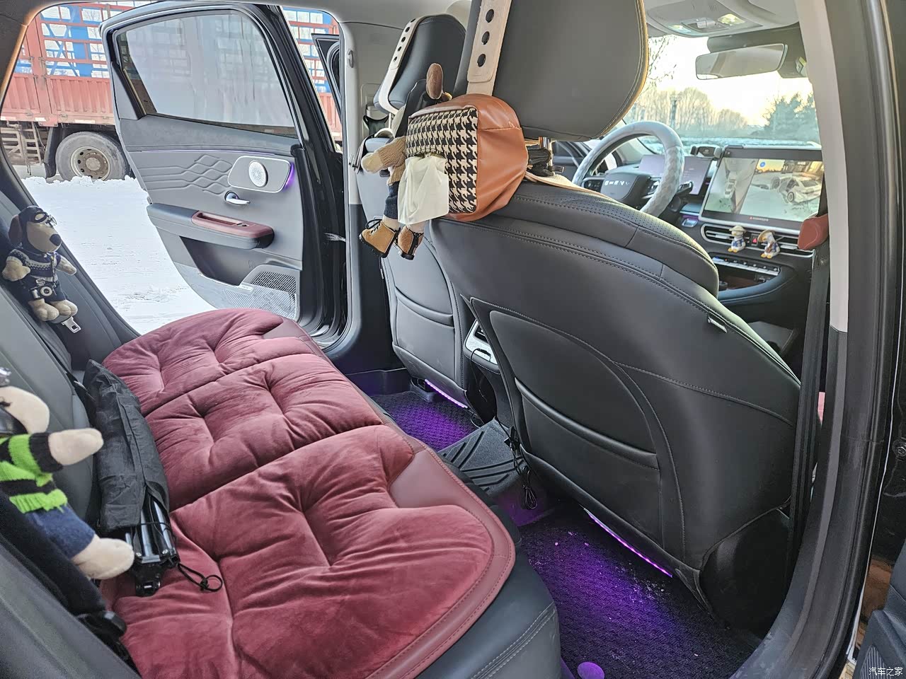 空间必须重点夸!我1米62,调完主驾座椅头部还有一拳多距离,方向盘握感好,长时间开不累。老公1米75坐前排不压抑,后排腿部能留两拳多空间,跷二郎腿没问题。周末带爸妈逛街,后排坐三人也不挤。 后备箱能装下我的教案本、老公的钓鱼装备和土特产,全车好多个储物格,手机、钥匙、水杯都有地方放,太实用了。