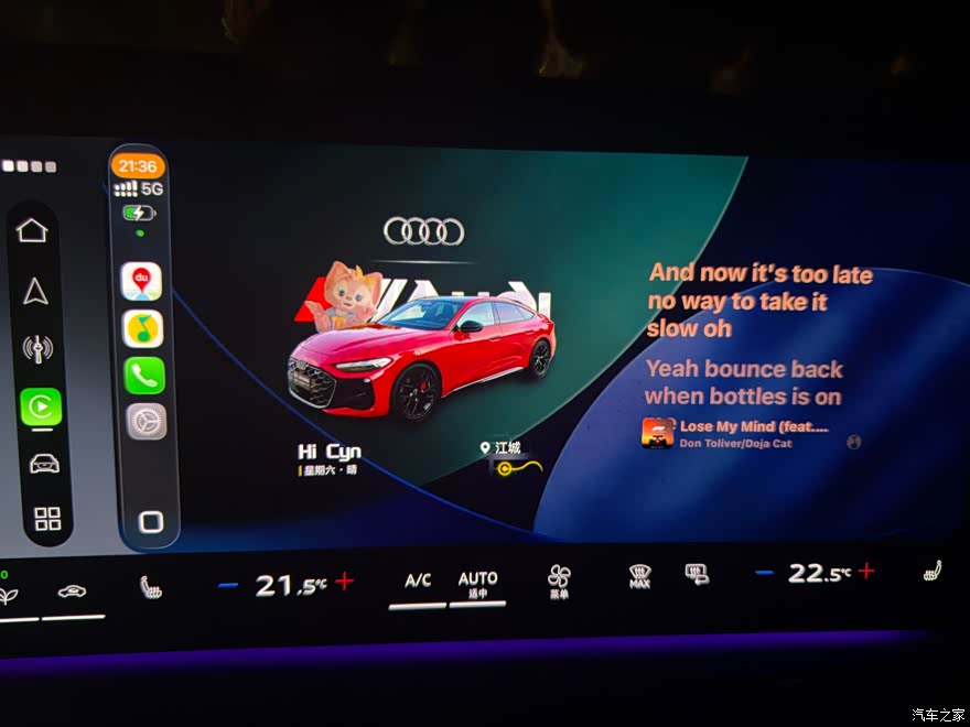 1.自己开车时 驾驶座特别舒服,屏幕和按键都朝我这边,操作顺手。握着方向盘感觉整个车都在掌控中。 2.晚上开车时 氛围灯一亮感觉就来了,配上BO音响特别有氛围感。
