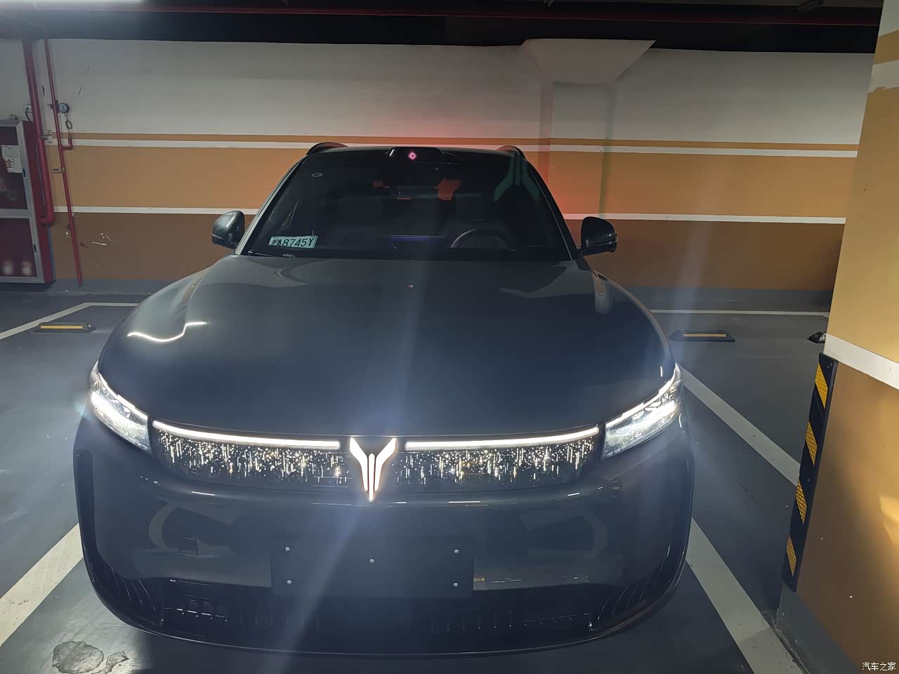 外观我选的是宸星灰,在4S店里看白和黑太常见,琉璃紫对我家用来说有点抢眼,展厅那台宸星灰车身一眼就稳住了我的心,这个灰不是发闷的那种,灯光暗时偏黑一点,金属感很清晰,太阳下面尤其傍晚带夕阳,漆面里的金属颗粒会出一点淡淡的棕调,层次拉出来,整车造型走大气稳重路线,车长近五米,这颜色把比例拉得更修长,前脸星钻发光格栅,晚上解锁灯带像水流一样亮起,仪式感就有了,侧面线条顺,隐藏式门把手收进去,整体很干净,20英寸的轮毂造型也合拍,这车上路不是抢眼那类,属于耐看。