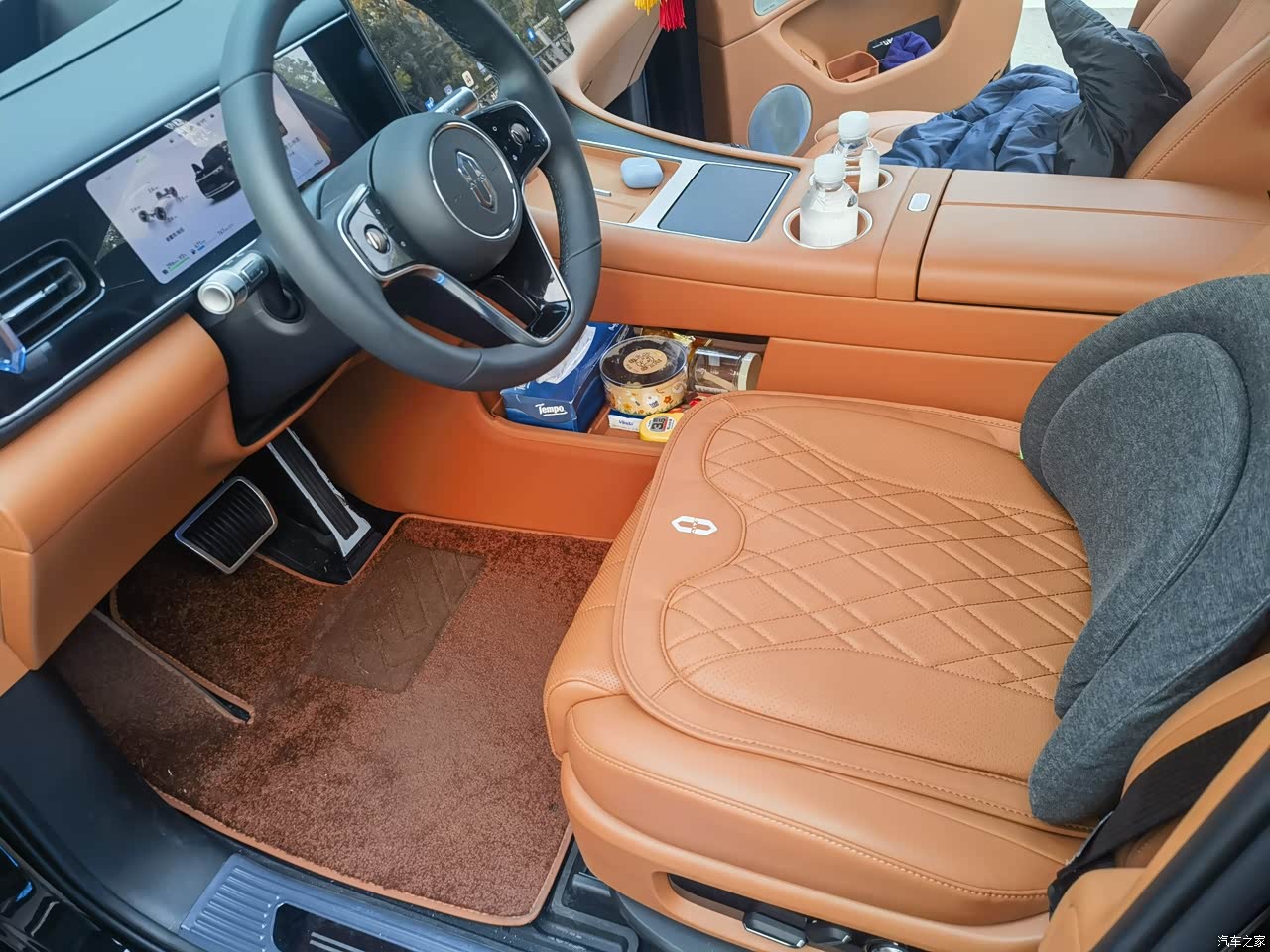 我选了赤茶橘内饰,年轻有活力。冰箱彩电大沙发全部是配齐的,真皮座椅按摩通风加热也全部都有,两侧氛围灯也不错,我还是挺满意的。