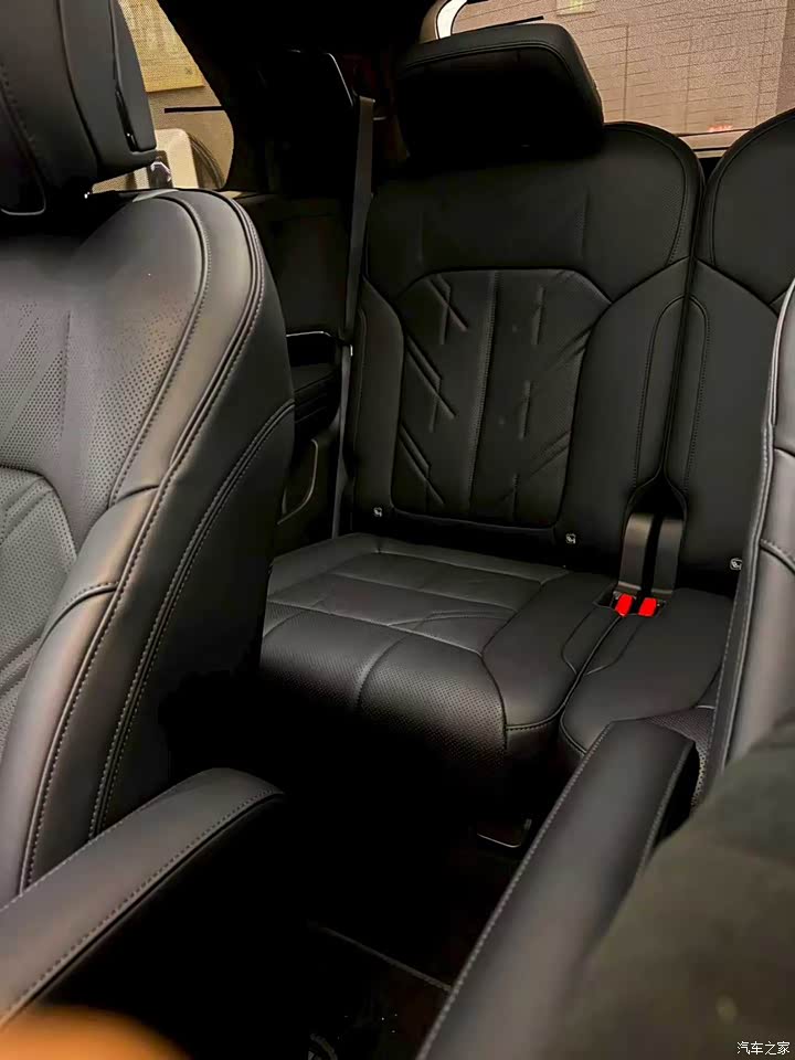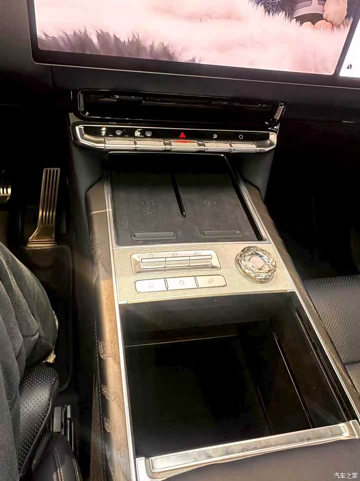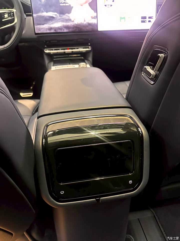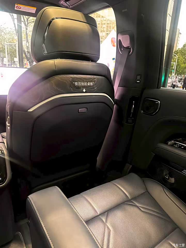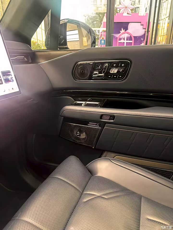 前排设计风格的很年轻,多块大屏幕也很有科技感,车内的灯光运用也较为美观。用料很好,手能摸到地方全是很柔软的材质,问了一下销售才知道这台车用了大量的Soft Nappa皮,所以内饰豪华感足。飞翼屏很有创意,悬浮在车顶上方通过一个轨道前后移动,不仅没有占地面空间,而且还把天窗空间给省出来了。实体按键很多,有水晶旋钮和金属质感按键,看起来比较有档次感和奢华感。