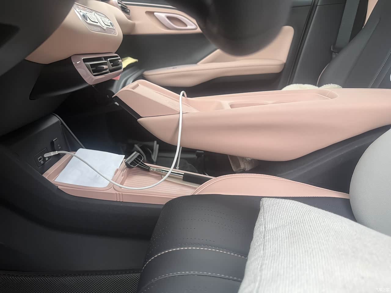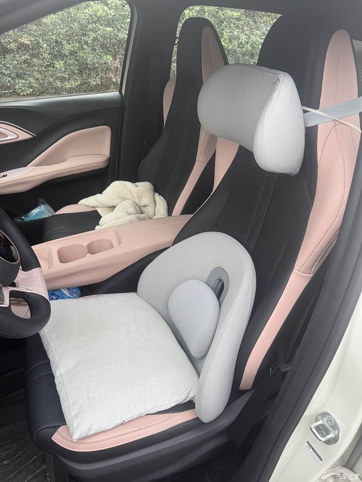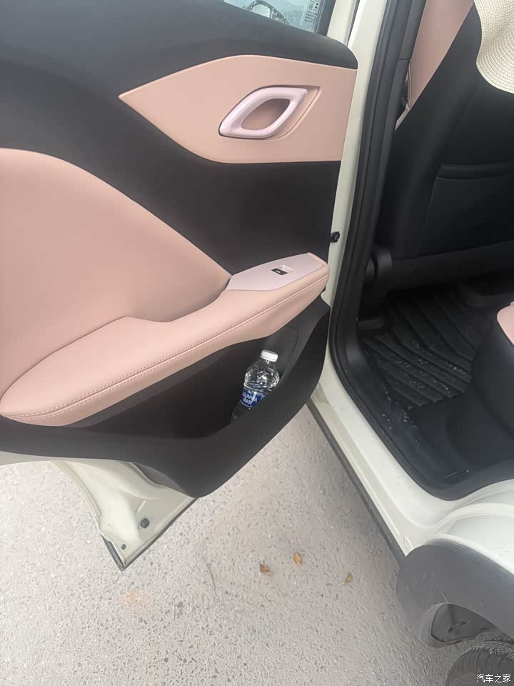 这个粉色很不错,久看不厌。无线充和底部的收纳盒本来是黑色,我自己买了粉色的硅胶套和硅胶收纳盒,看起来也还不错。车门可以放两小瓶矿泉水。 后排没有顶灯和空调出风口,一个人开车也不怎么影响。
