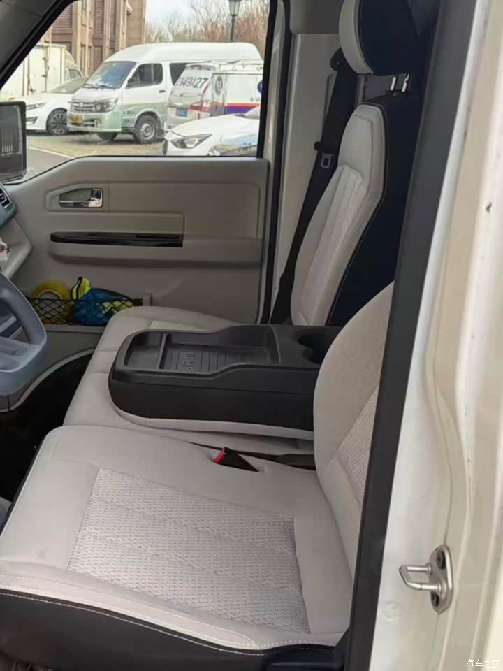 货箱可以坐人也能随时拉货 。平时如果是拉货的,后排座椅侧挂起来,虽然说这个颜色比较浅,但是的还比较耐脏,比我想象当中就是脏了的话,拿纸巾或者抹布一擦就好了,布座椅比较透气,做起来也比较舒服,尤其是它这个前排驾驶室设计,我平时也可以躺着休息一下。前面车头不是很长,反正视野的话也很开阔,很明朗。