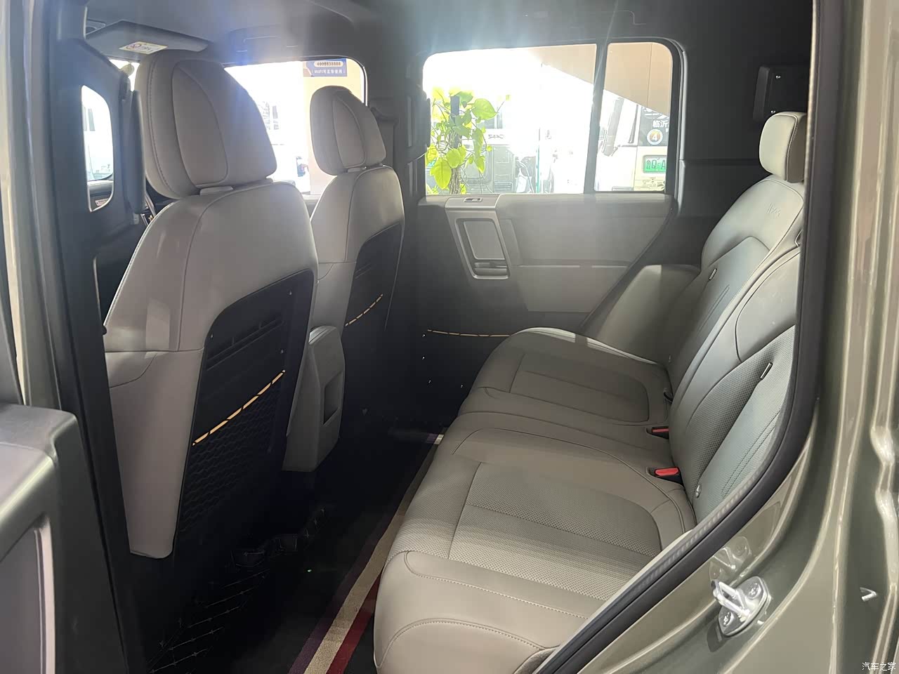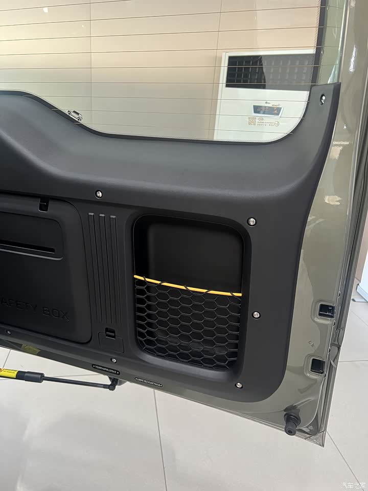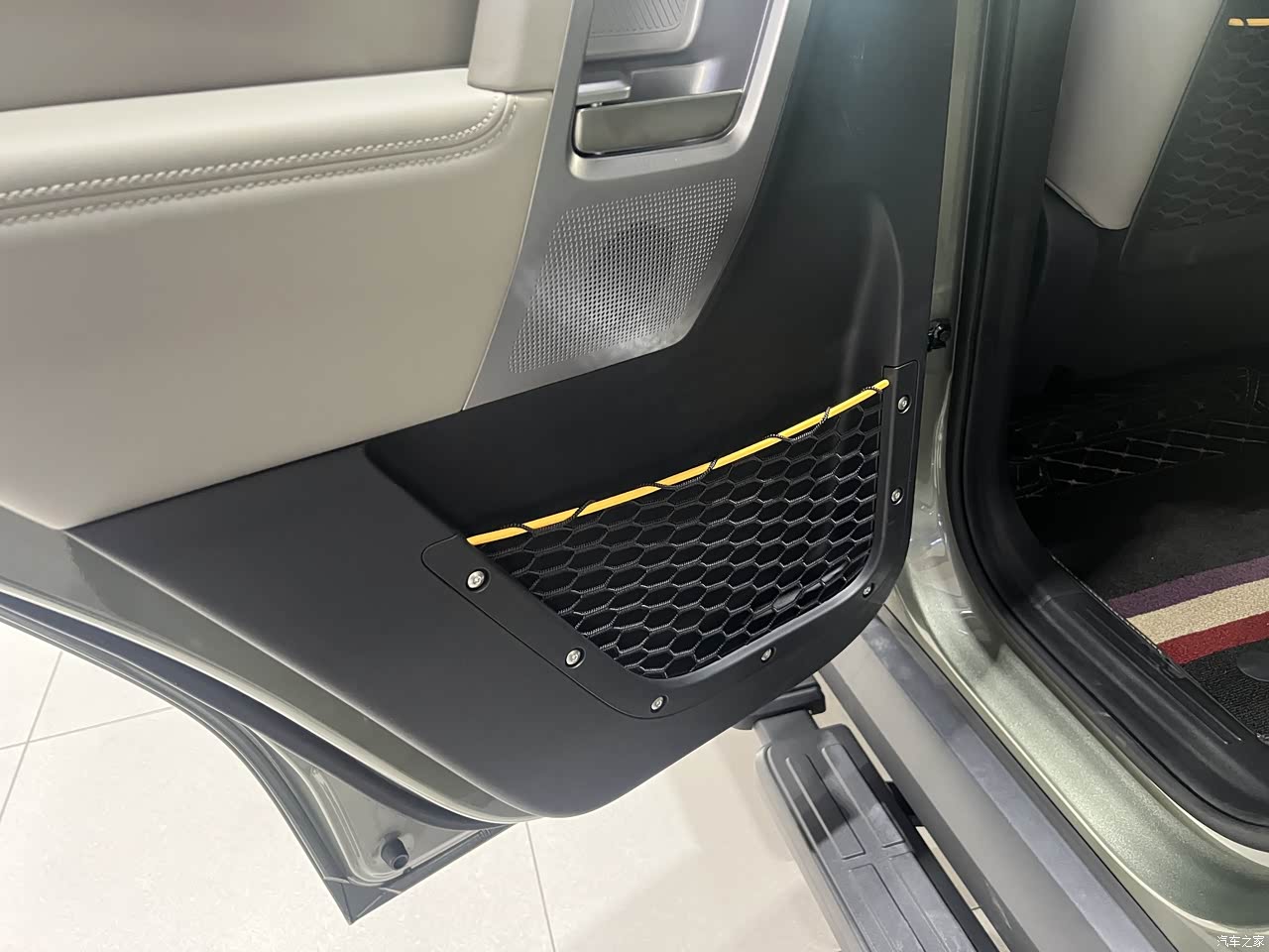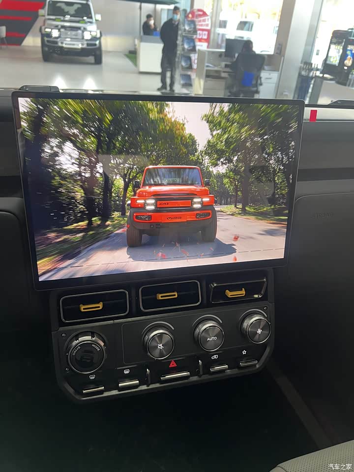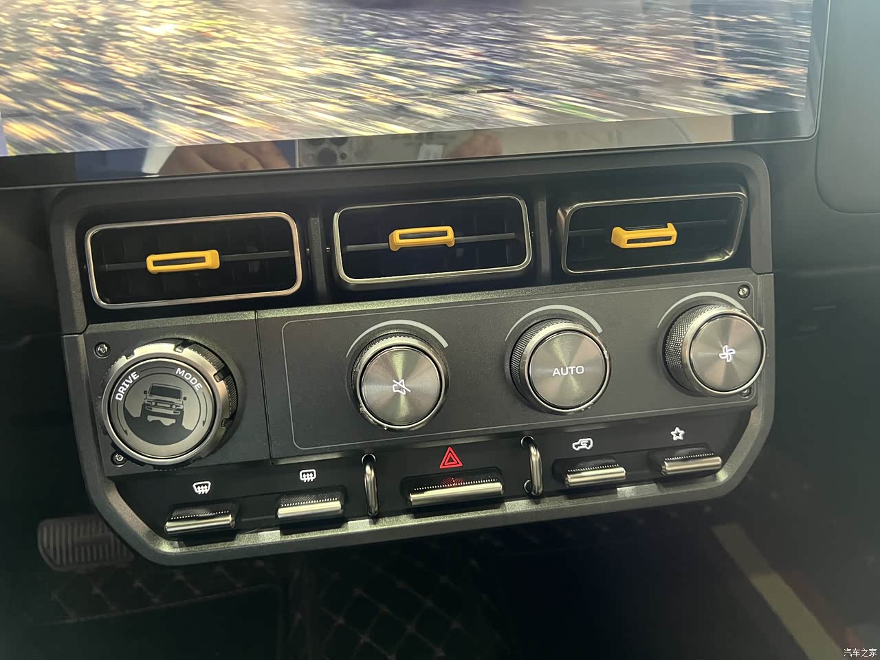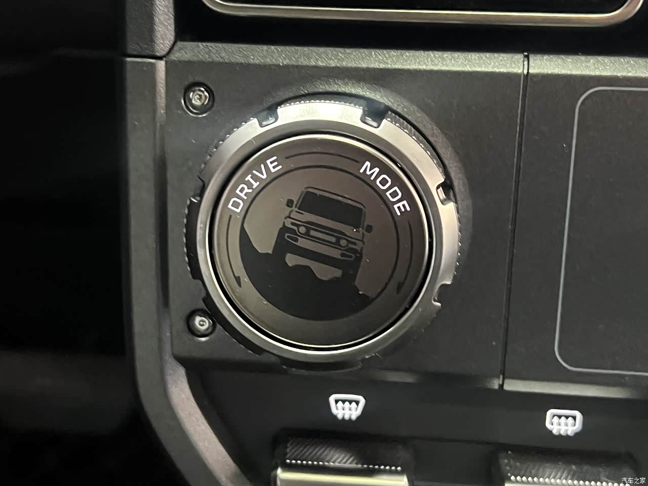 内饰这块我感觉这个车坐的很精细,我看的这个车是新能源车,但是这个车却有着硬派越野车的外观,细节方面做的很用心,比如,车子A柱上的抓手、空调出风口上面红色的东西、侧门做的很精致,中控驾驶模式转换按钮上有越野车的标识,大屏也显得很气派