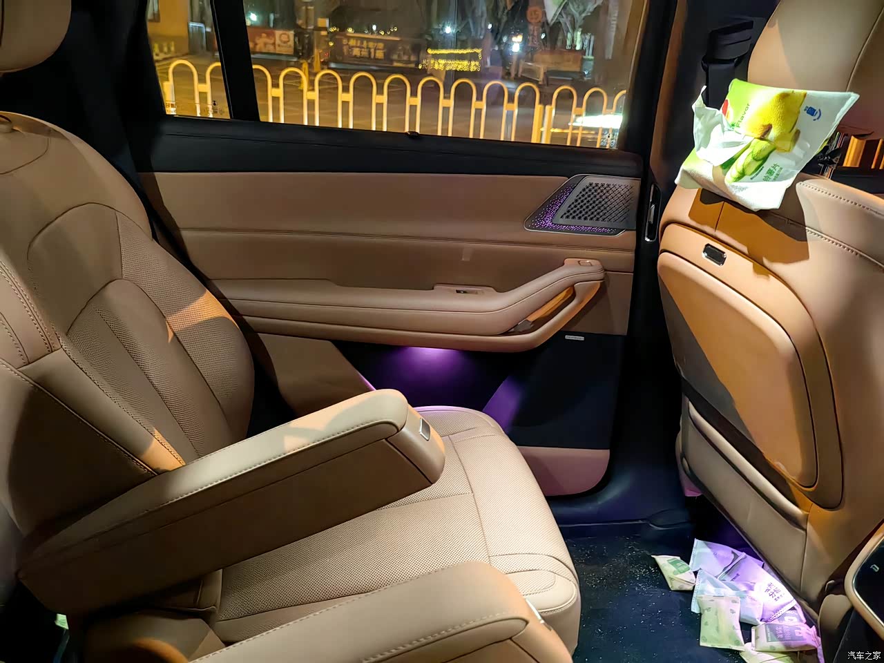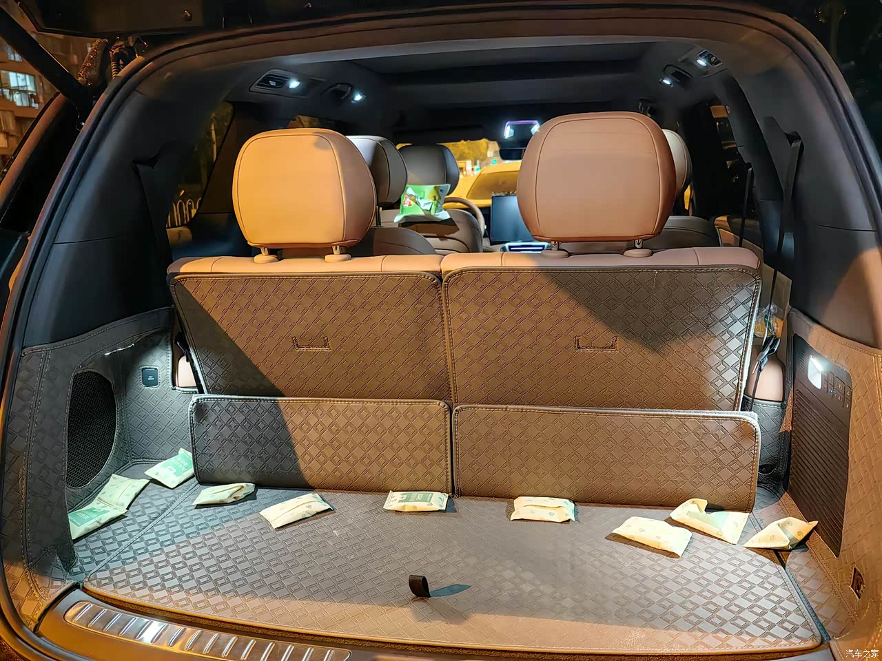 车内空间巨大,真正让全车六人都能享受“头等舱”待遇,完全摆脱了传统六座SUV第三排“应急小板凳”的尴尬,正好上周末家里大小六个人回老家,即便成年人坐进第三排,也能获得充裕的头部和腿部空间,告别蜷缩感。因为不是航空座椅,所以中央过道也比较宽,进出第三排非常方便。第三排座椅还支持前后电动滑移和靠背角度调节,满足各种情况下的乘坐需求。 一二排四个独立座椅,均配备通风、加热、按摩功能。舒适性拉满,第三排座椅也很厚实,同样配备座椅加热功能,靠背角度还可调。在六座满员状态下,后备箱也可以装不少东西,尤其后备箱盖板下还有一个下沉式隐藏储物格。