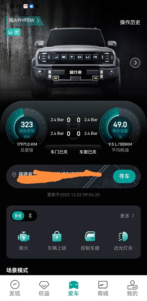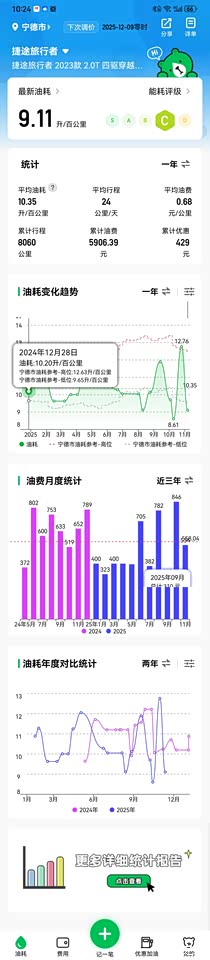 车子已使用两年,总里程17971公里,综合平均油耗9.5升/百公里(捷途app显示);驾驶一段时间后开始用小熊油耗记录,平均油耗为10.35升/百公里(总里程8060公里)。其中:高速6.8-7.8升/百公里,省、县道7.8-8.2升/百公里,城区8.9-10.4升/百公里。之所以平均油耗大于细分的油耗,主要原因是怠速空转所致。以排量2.0T、车重2.2吨、方盒子造型(风阻大)等因素综合研判,旅行者的油耗不算高,且使用92号汽油,对此还是相当满意。