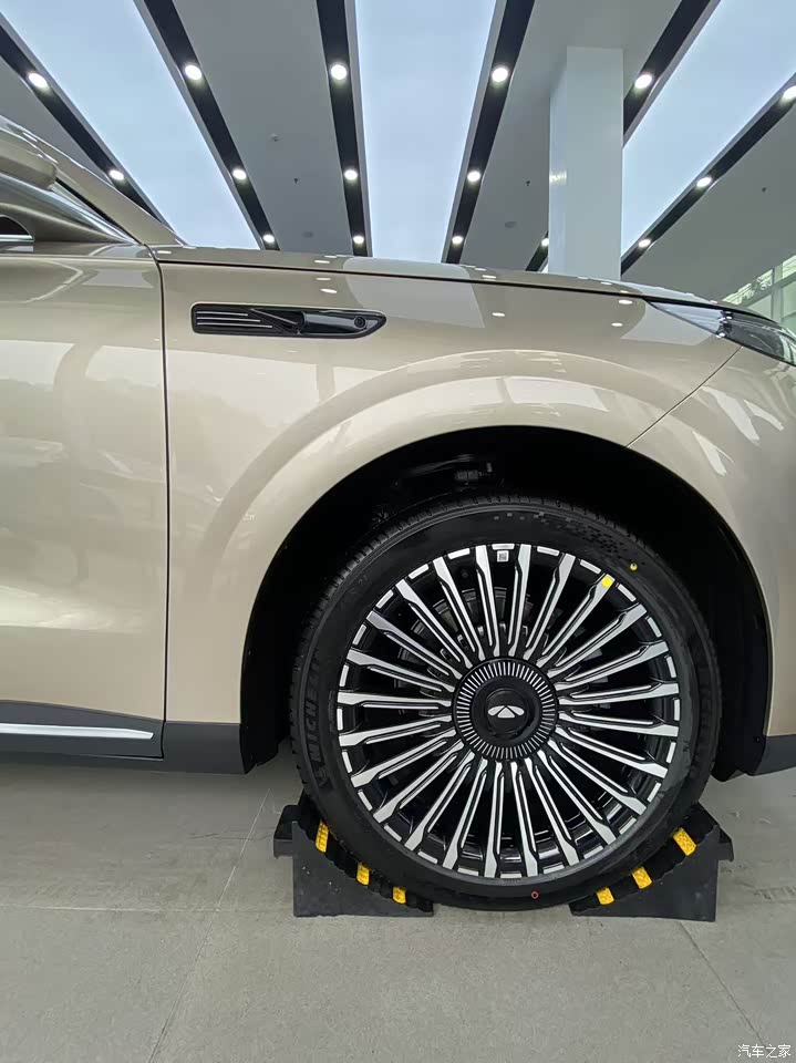 顶配车型通常在外观上有专属标识或细节装饰,整体气场更足。我所试驾的这款配备的21英寸低风阻高性能轮毂堪称外观灵魂,造型极具未来感和力量感,与隐藏式门把手、贯穿式灯组共同营造了远超其价位的高级观感,静态驻足率很高。