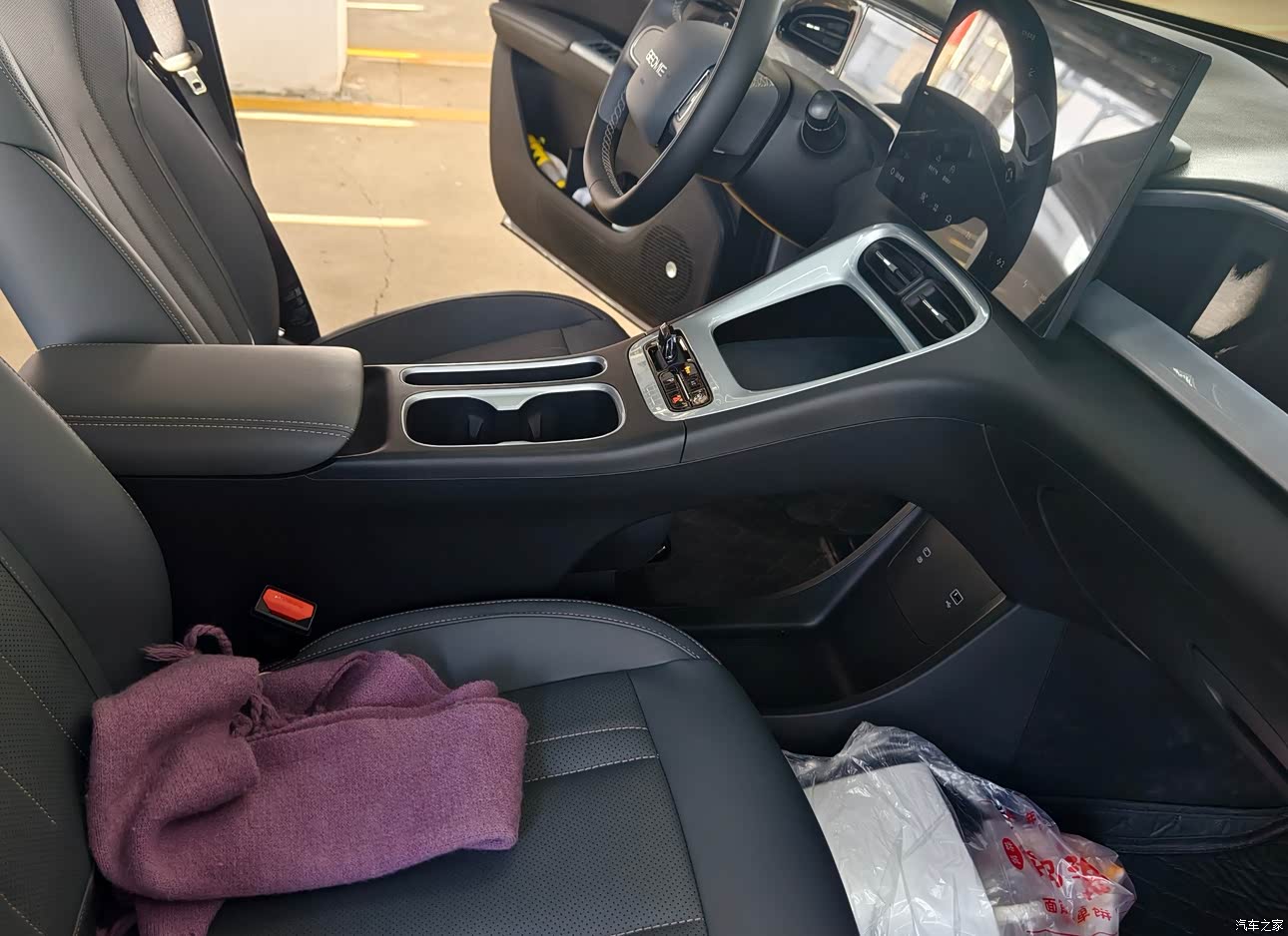 内饰是简约风,中控大屏特别吸睛,界面布局清晰,操作起来很流畅,基本没有卡顿。座椅的仿皮材质,包裹性也很不错,一小时车程也不会腰酸背痛。门板下方、中控下方、中控区域都是硬塑料,摸起来有点廉价,不过这个价位,它也没嫌弃我,我还有啥不能接受的。黑色内饰耐脏又百搭,看着很是舒服,送的这个脚垫好些时候会在地板上踩出白色的灰尘印,最好还是换个脚垫了。