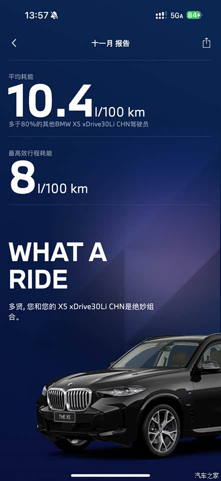 驾驶感受目前就是两个字:爽、稳,因为还没过磨合期,还没试过地板油。但已跑过一趟高速体验了辅助驾驶功能在前方有车时会自动减速,并保持车道居中行驶,开起来更轻松了长时间开车也没那么累了。 X5搭载的B48发动机匹配8AT手自一体变速箱,调校相当完美,动力输出非常出色,前胎275后胎315的胎宽,说实话在高速路上就是稳当当的,不知不觉就上120码了真没感觉。在市区超车切换运动模式并挂入S档后氛围感拉满,动力精准输出,操控精准给自己足够的信心。而且方向盘不是想像的那么重,非常轻盈,感觉不像是开这么大的车。 经济模式下动力输出则平稳许多,加速不急不躁,有家人坐车我就切换经济模式后,可以缓解晕车。刚开始驾驶时,由于车身较大、动力又强,频繁加减速容易导致车辆点头,后排的人会有些不适应。有家人坐车我就切换经济模式后,慢慢的适应了后这种情况就少多了,应该是我驾驶习惯的问题,要怪只能怪上一辆动力大差了🤭
