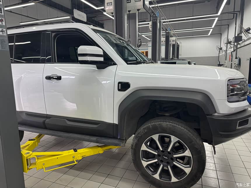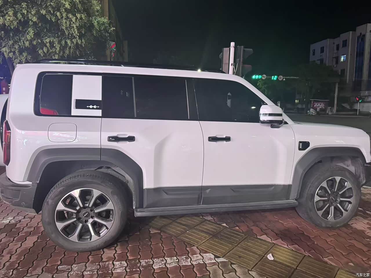 车头大灯造型霸气,长方形环形灯带,跟车形很配,白色车身耐脏,视觉上白车看着更大更舒服。侧面方程豹标志很亮眼。