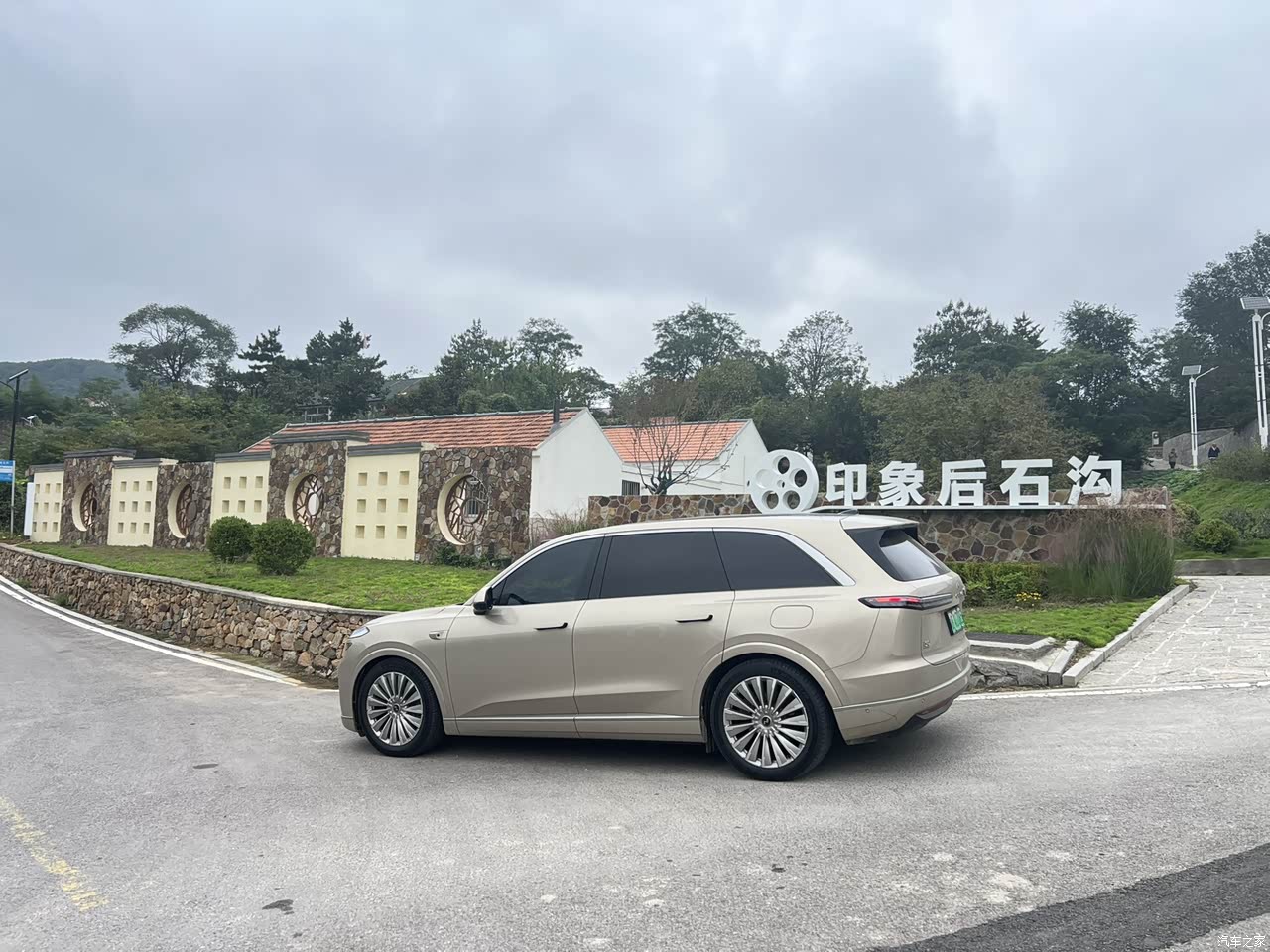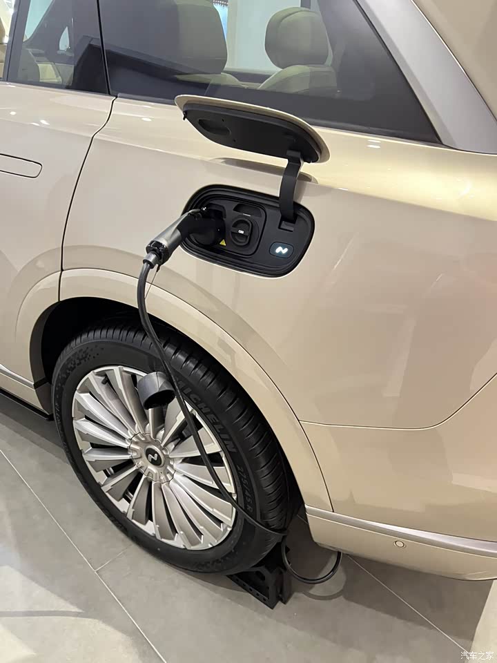 外观中规中矩,五米二的车身,标准的大型SUV,很大气,很商务的感觉没有激光雷达,头顶两个小触角辨识度很高,我选的金色外观,算上新出的黑骑士配色,一共有七种配色了,除黑白外都是要加钱选配的哦。 我想的是21寸轮毂的选装,确实比标配的小轮毂大气很多,大车就应该配个大轮子嘛。