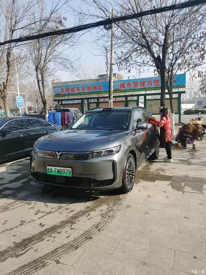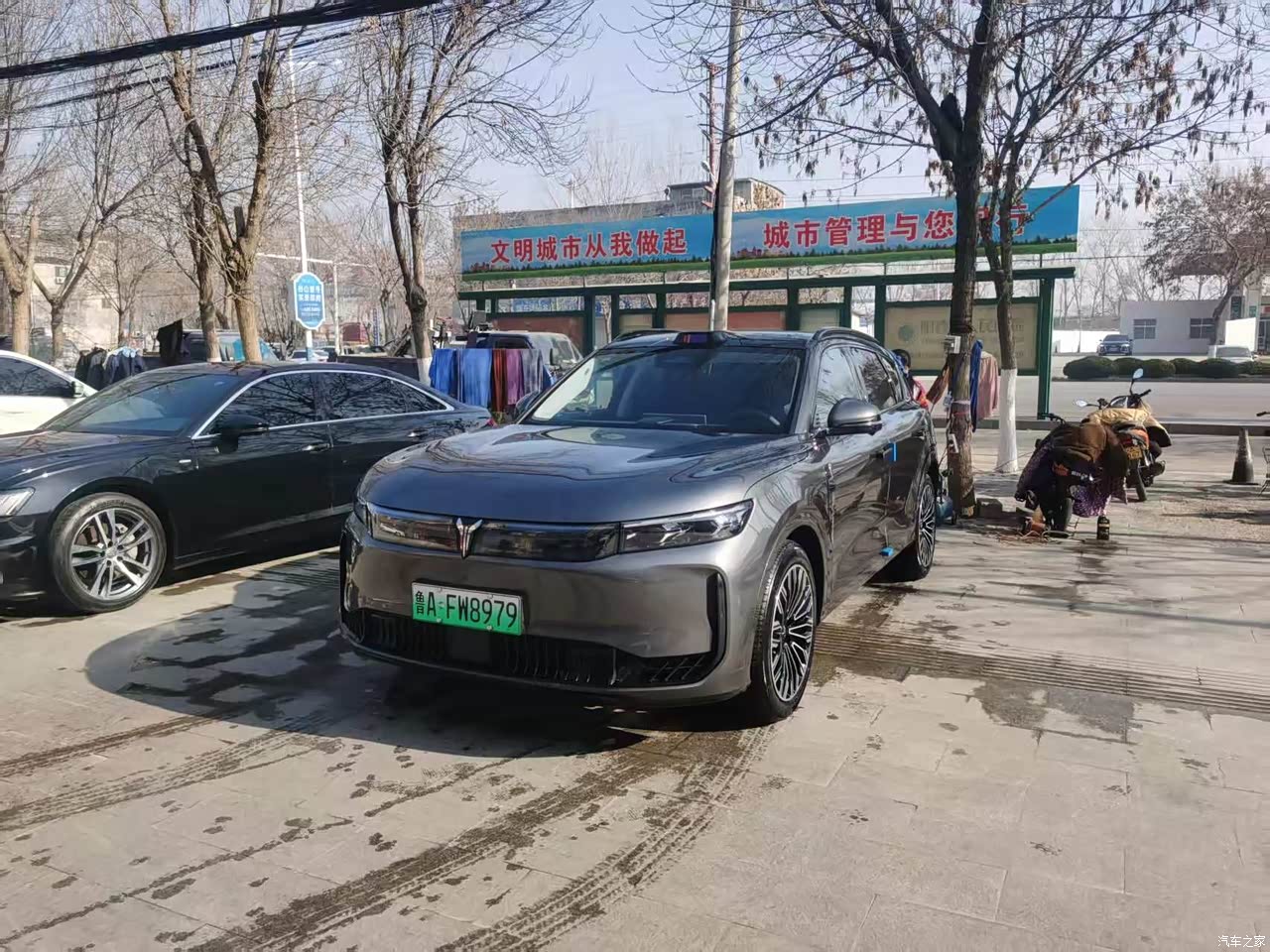 外观我选的宸星灰,阴天或者地下车库是偏深的那种灰,质感稳,太阳斜着打过来,金属的细泽就晃出来,里头像掺了点很克制的蓝紫细闪,整车看过去有股子沉静的味道,车头半封闭,贯穿灯带连着会发光的VOYAH车标,晚上一亮辨识度到位,侧面是我最爱看的角度,车长4915mm,线条顺着走不方,带一点溜背,隐藏式门把手把侧面拉得干净,20寸轮毂把气场托起来,尾部贯穿式尾灯点亮有流水效果,这套外形不是那种张牙舞爪,更像把力量收住了的状态。