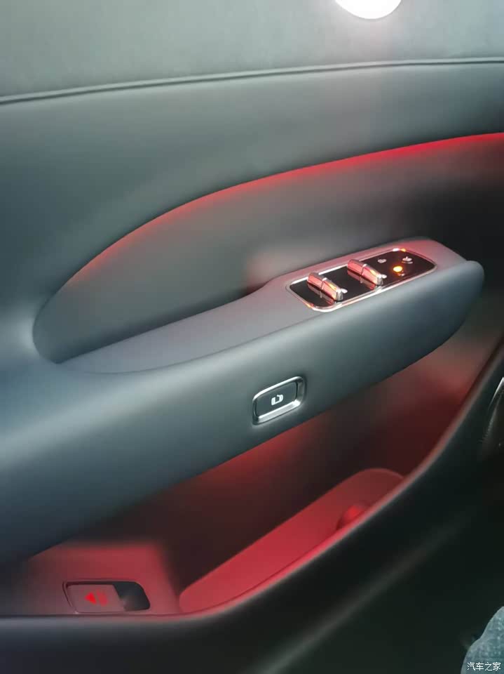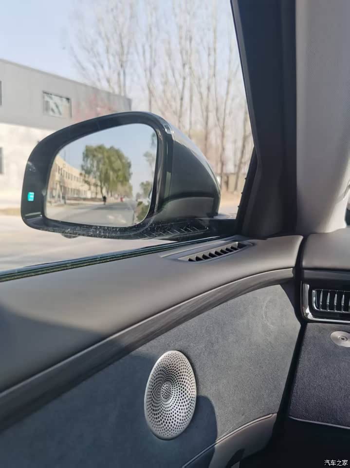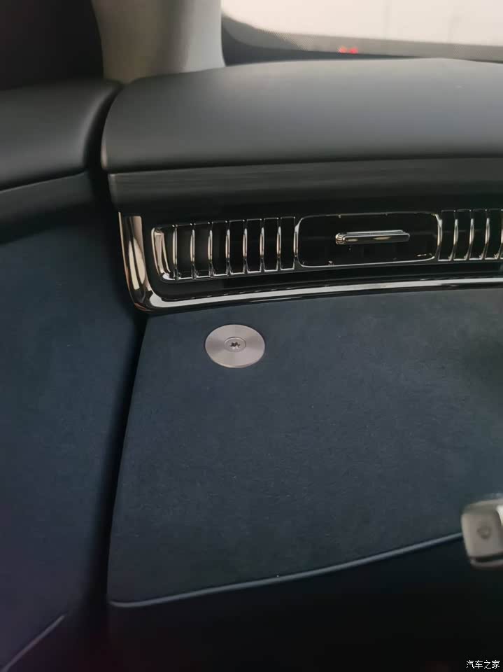 坐进来是深海蓝的内饰,那种深很稳的蓝,把心收一收也就安静了,中控台上方是软的,仿麂皮包裹,点缀几条哑光金属饰条,氛围低调,不夸张,比纯黑多一点活力,又比棕色更克制,细节上我去抠了几处,中控大屏边框的接缝看见一点不那么绝对平直的地方,门板蓝色皮革的缝线在某些角度能看见针脚均匀度的轻微差别,不专门盯着看完全忽略,摸起来都是软的,日常用没有阻碍,只是把心里那个完美豪华的标尺拿出来,会留上一点点遗憾。