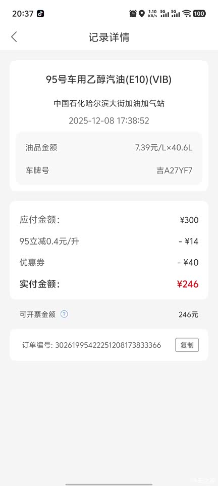 油耗这块你得听仔细了,对你绝对有帮助,嘎嘎真实,先上图,从24/11/20提新车到今天25/12/8,多少天我也不算了,新车初始里程就从28公里开始算,不过分吧,到现在一共行驶14028公里,一年一共行驶14028-28=14000公里,至于加油,我记得很清楚,因为除第一次开出4s店加414元中国石油的油,其余都是中国石化充值加油,不为别的,就为了中国石化有优惠,就为了不下车,加完就可以走,所以直接上图,看充值记录,这里我得提一句,长春不愧为省会城市,不愧为老汽车厂,中国石化有两个优惠政策,一是充值赠券(详情看图),二是95优惠0.4元/升,这里14000公里用了多少油,我给大家算一下,数学不好,算错了大家纠偏啊,我不生气,414+3800+800+2800+1600+800-223+(440+80+320+160+80-40-40-246)=10745,括号里是赠送的券,为什么括号最后-40?因为剩一张40的还没用,-40-246是今晚刚加的油还没开始跑。不能算,这里10745元是每公里优惠0.4元之后的总油费,优惠之前多少钱不会算,想了解的朋友,你就当我们这里汽油便宜吧,简单算一下,10745/14000=0.7675元/公里,我们这都是乙醇汽油,冬季寒冷-10度到-28度左右,有100天的时间,夏季车走就开空调3档20度,14000公里绝大部分是市内,比较拥堵,快速路也开不起来,高速路几乎没怎么开,累计高速也就200公里的样子,可以忽略不计!我们这现在95#乙醇汽油油价7.39元/升,一年累计行驶14000公里,评论每公里0.77元,实际油耗百公里0.7675*100/7.39=10.3856升。手机app显示9.6升,这里车机在4s店大升级过一次,不知道有没有影响,不能说不准,只能说接近!优惠之前怎么算,自己考虑吧,毕竟咱买车不是用来学数学的,其实0.4元/升相当于4分钱/公里!这车跑国道或者高速的油耗肯定比这还要低,车子这么大,还是2.0T排量,油耗中规中矩,谈不上费油,只能说不省油!网上那些抱怨满箱油跑450公里的,不是黑子,都是纯市内用车环境,堵车情况比较严重的,这车怠速等红绿灯的时候确实停烧油的!