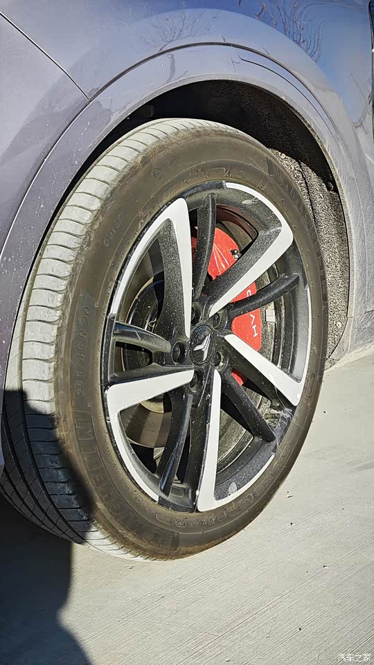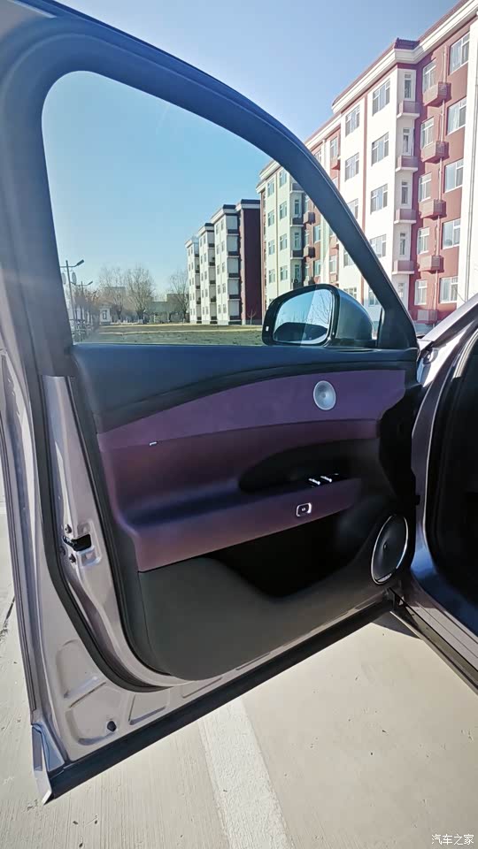 外观我选了琉璃紫,展厅灯下看着有点珠光,太阳底下是深紫,收着劲不跳,光线暗一点或者灯一打又透出蓝紫的味道,质感立起来了,车长接近5米,整条侧面是游艇那种顺着走的线,气场有,精神也有,20英寸轮毂样式跟车身LOGO有呼应,细节还算够,隐藏式门把手用久了就顺,靠近弹出来,锁车收回去,干净利落。