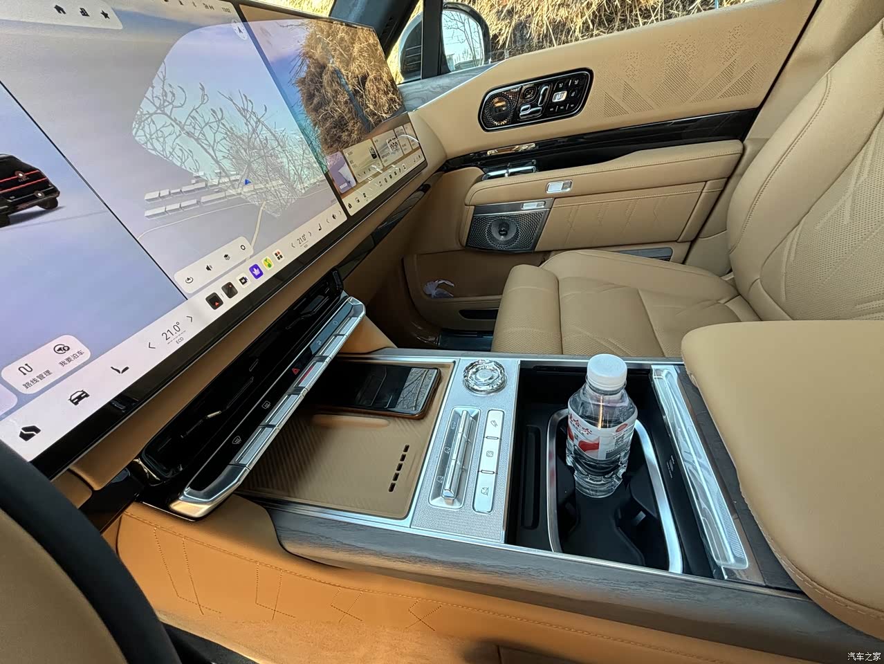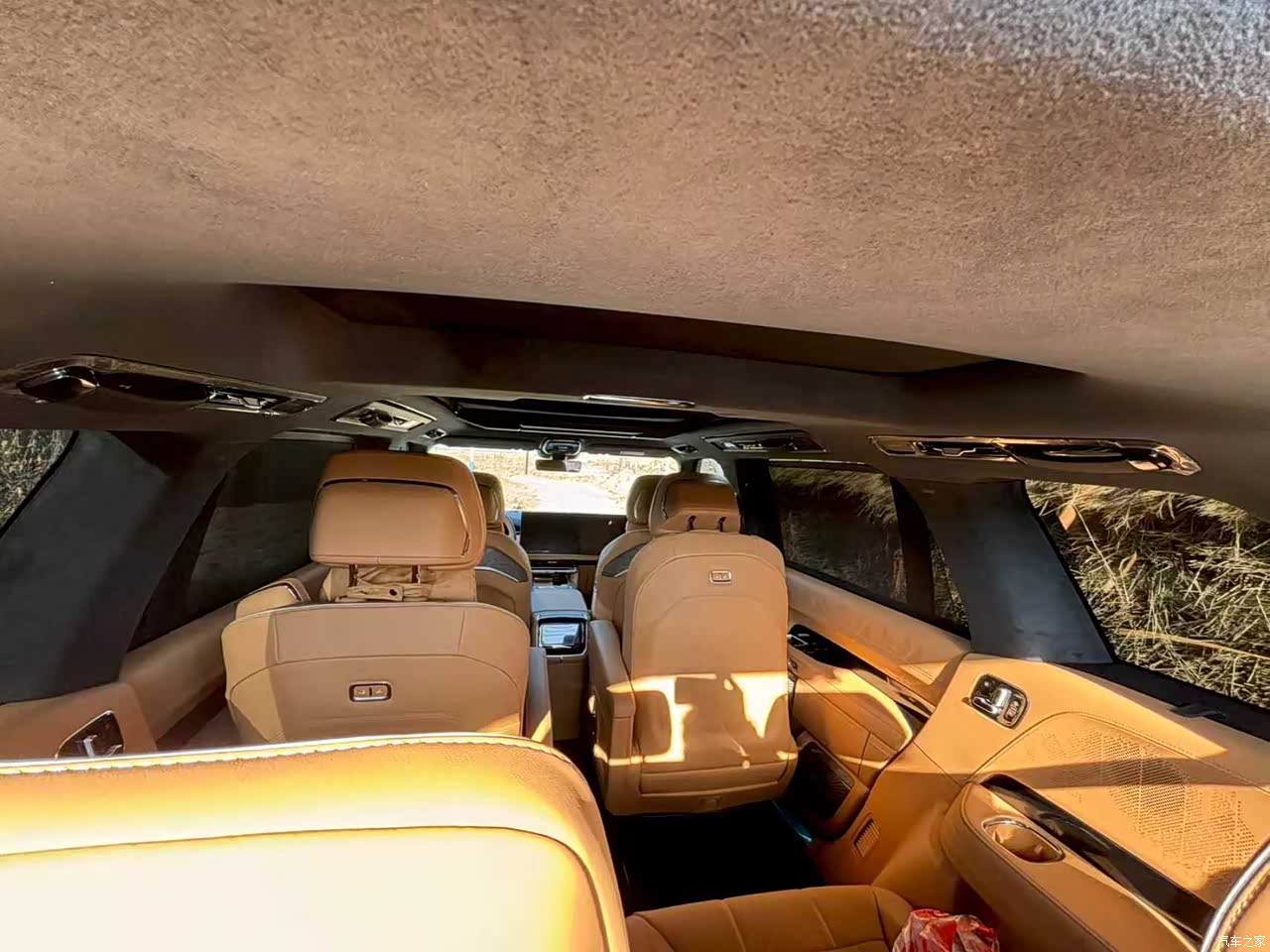 坐进车内的瞬间就会感到内饰豪华感足,全车大面积采用Nappa皮包裹,摸上去比家里的沙发还细腻一些,车内还镶嵌了一些进口实木装饰板,整体的奢华氛围挺不错的,内饰是深棕色,看起来比较温馨也比较高级。中控台的双联屏设计,看起是科技感与豪华感的结合,后排的天翼屏就是内饰的新高度了,也是打动我买这台车的主要原因之一,它不仅不侵占天窗空间,还支持电动调节,整个机械机构可以前后移动,还可以调节角度,在所有9系SUV里面是独一份。