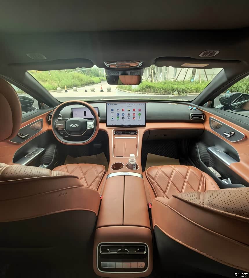 车内使用了大量的软包材质,摸上去看上去都很有感觉,座椅使用打孔工艺,有加热通风按摩,能够应对南北方各种天气,夏天再也不用后背屁股下边湿漉漉的了。就是门板下方和中控台下方使用的是硬塑料,有点硌腿,这个可以改进一下。还有顶棚要是能使用麂皮材质,那就更好咯。