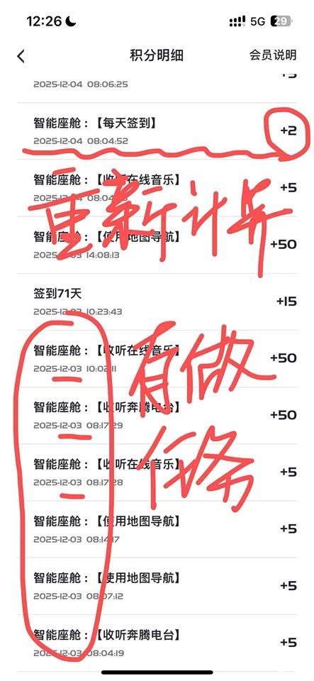 我最想吐槽的就是这个APP的签到功能。明明12月3日已经完成了当日任务,但是签到是独立的,非得手动去签到一下,导致前面2个多月所有的连续签到前功尽弃,好气哦! 建议厂家完善一下,车机服务不要这么机械而是可以更人性化。