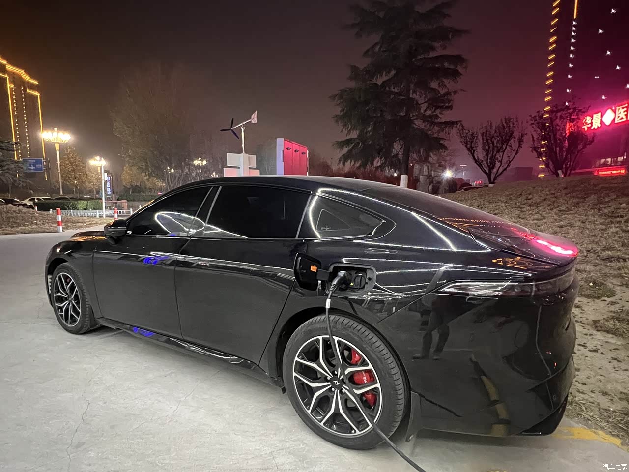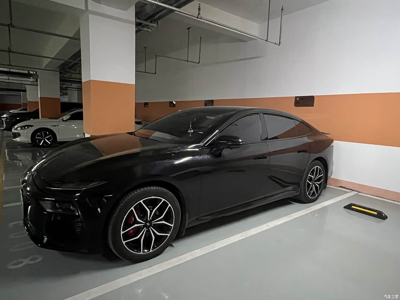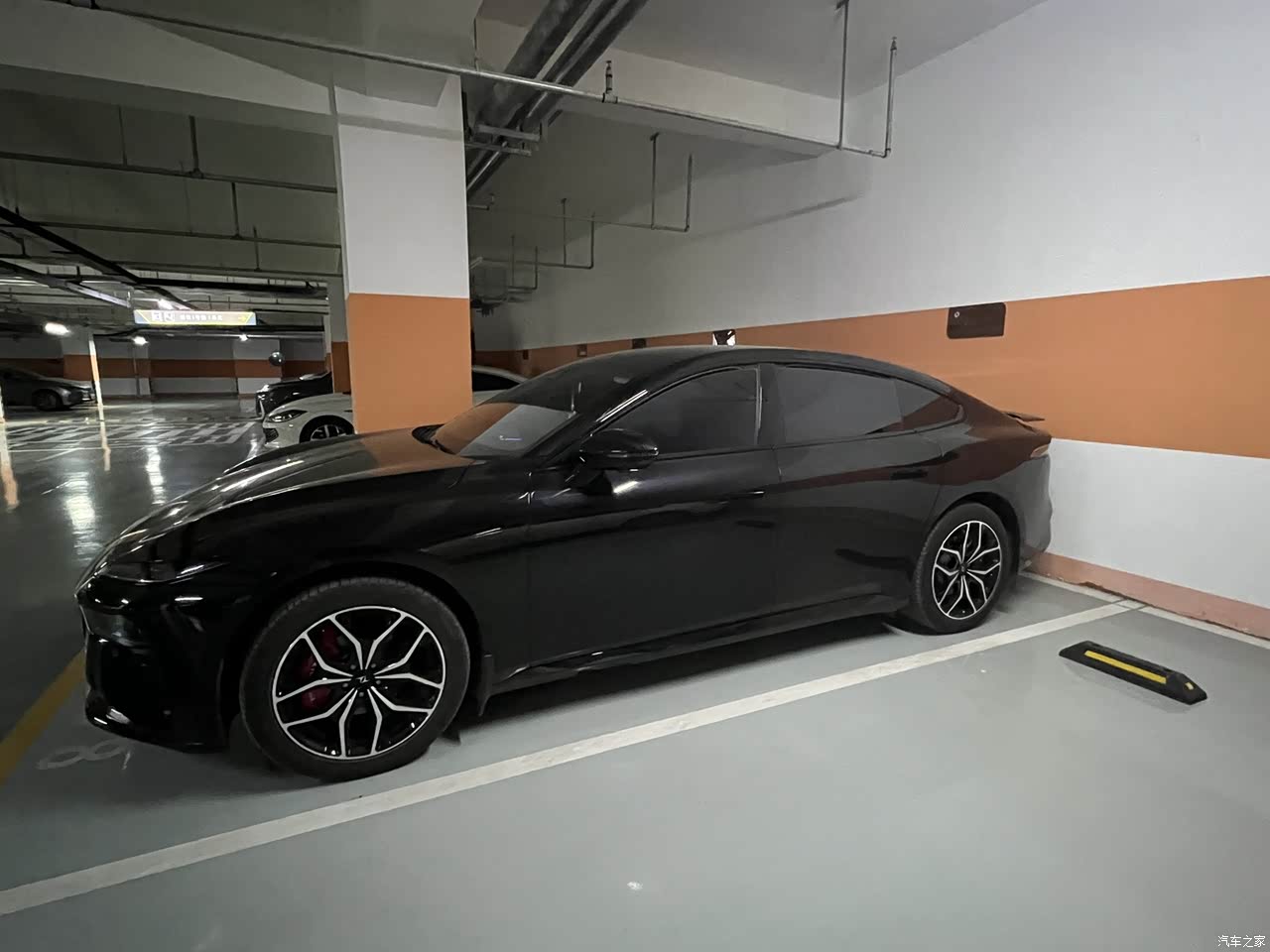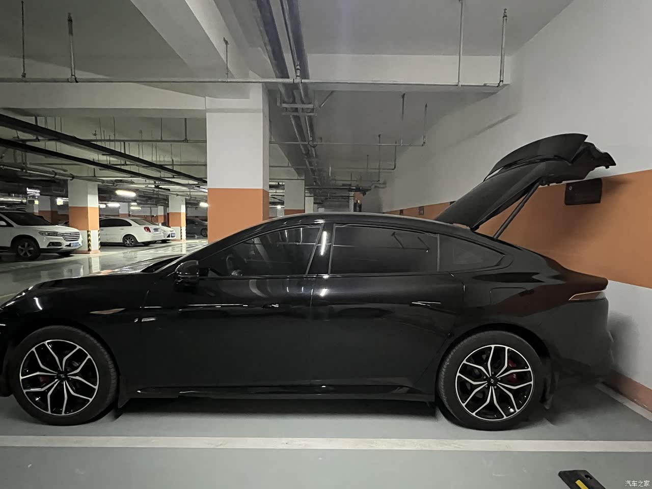最满意的还得是那股低趴的轿跑味儿,第一次进店那么多车一排摆着眼睛就钩住在它身上,脚下像被粘住,夜影黑这个色听名儿就带劲,真车看着不是死黑,漆面里像撒了很细的亮点,太阳一照层次往外冒,通透,销售嘴里高透清漆工艺光泽度说比普通漆高四成,具体啥意思不研究,看着顺眼,黑色不耐脏这点心里有数,落灰显得清清楚楚,周末手痒把车开去冲一冲,就想把那股整车的稳重气质一直维住。车身的姿态一张开就能看出来,接近四米九的长度,两米九多的轴距,中大型的个头,宽体低趴那种摁住的感觉,侧面从B柱往后溜背线直接压下去,干净,门把手藏着,人靠近弹出一声很脆,无框车门一拉科技味儿和运动味儿就起来,地库取车还没走到车跟前钥匙一按地上的蝶影光毯铺开一片,脚步顺着光走过去,一天的工作收一收,像是这车在把人接回家。