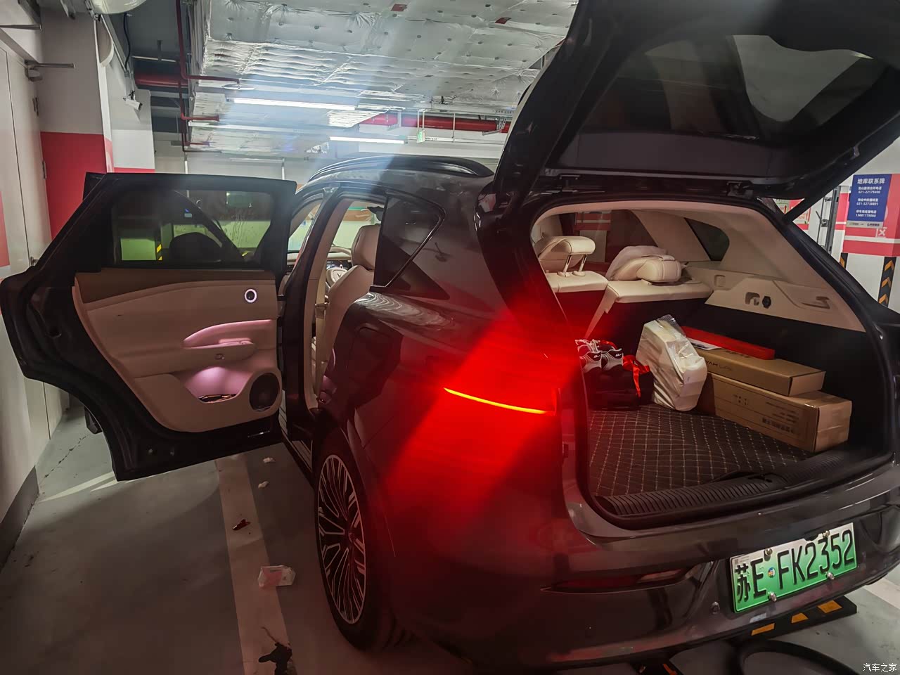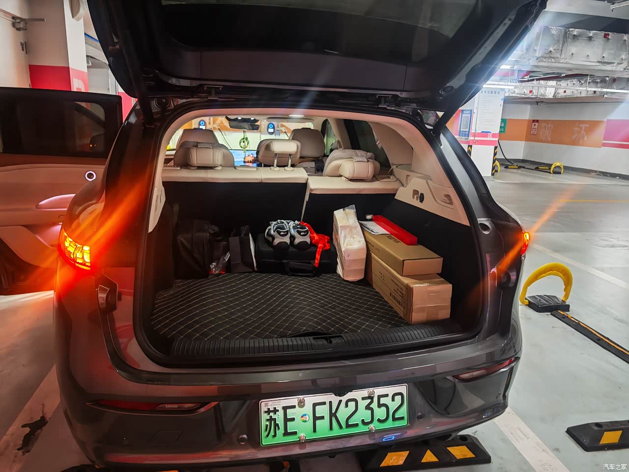 空间是大五座取向的数据与体感一后致,轴距2960毫米我身高一米八前排按自己的坐姿调好再去后排膝部到前排靠背有两拳多的余量,后排地台中间凸起很小接近平面中间乘员把脚摆放起来也不局促,储物细节做得周到门板储物槽尺寸充裕中控下方有放手机的无线充电位置, 扶手箱里设计了一个7升的冷暖箱夏天放冰饮冬天放热奶这种使用场景很贴近生活,后备箱常规容积590升空间又深又规整两个28寸行李箱再加几个背包轻松放进去,把后排放倒能做成近乎纯平的超大空间需要搬大件或者露营做临时铺设也能应对。