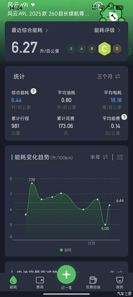 我用小熊油耗记录,我最近5次充电记录,有两次充到100%了,中间可能还会用了些油,但是油量剩余没有变化,所以先忽略,最近5次的满电续航169公里,因为用了油,实际其实还会更低!综合续航目前没有测试过