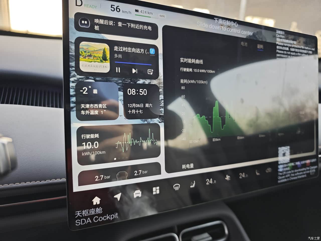 续航与能耗:扎实够用 我在天津,近期气温1-7℃左右,动能回收设定为25%。跑了高速、国道和城区综合路况,电耗表现如下: - 最低电耗:约10kWh/100km - 日常综合:11-12kWh/100km - 高速路段:15-16kWh/100km - 开启智驾后会增加1-2kWh/100km 满电状态在实际通勤中预计能跑500公里以上,对于这个尺寸的车来说,能耗表现我很满意。
