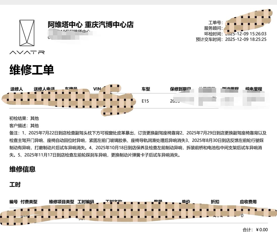 质量问题太多,一年不到,化身修车达人。感人,买车还能学到技术。换线束、车门、车窗、座椅;踩刹车左前舱异响多次维修。E值慰问!!!