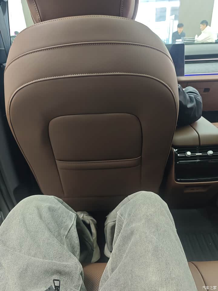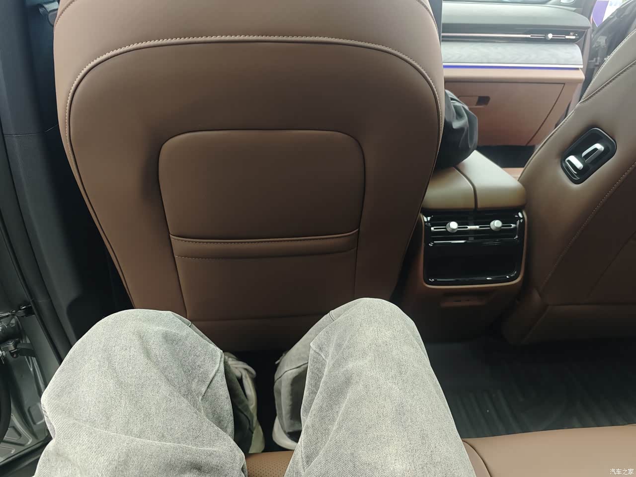 拉开厚重的车门,第一件事就是坐进后排。关键来了,我(身高1米75)坐到后排,可以看到我膝盖离前座还有快三拳的距离。这后排空间,是真的大。我往后排中间位置坐了坐,地台凸起不高,脚能放下,手摸到的地方,中控台上面、以及门板,用料质感都挺不错的。中间的大屏很抢眼,黑边控制得还行。空调出风口的设计看着也非常养眼。