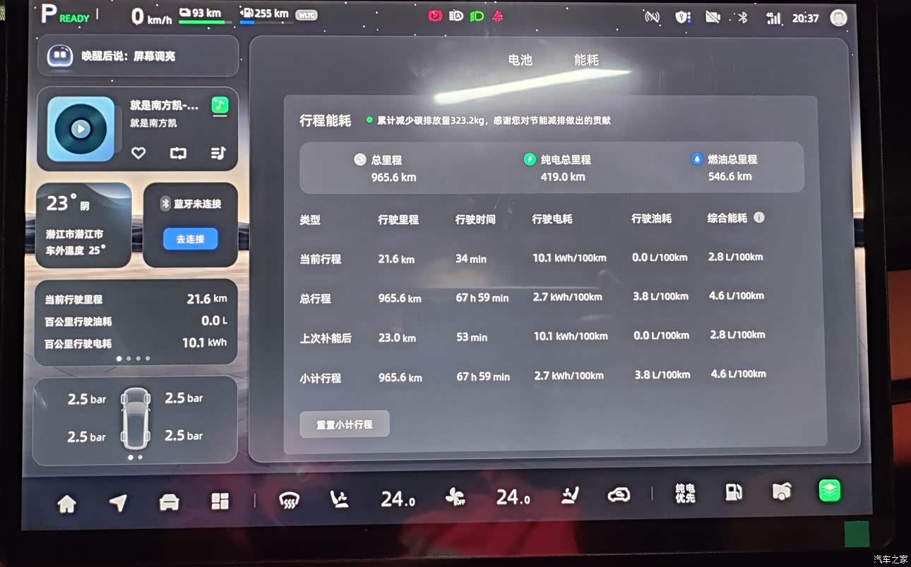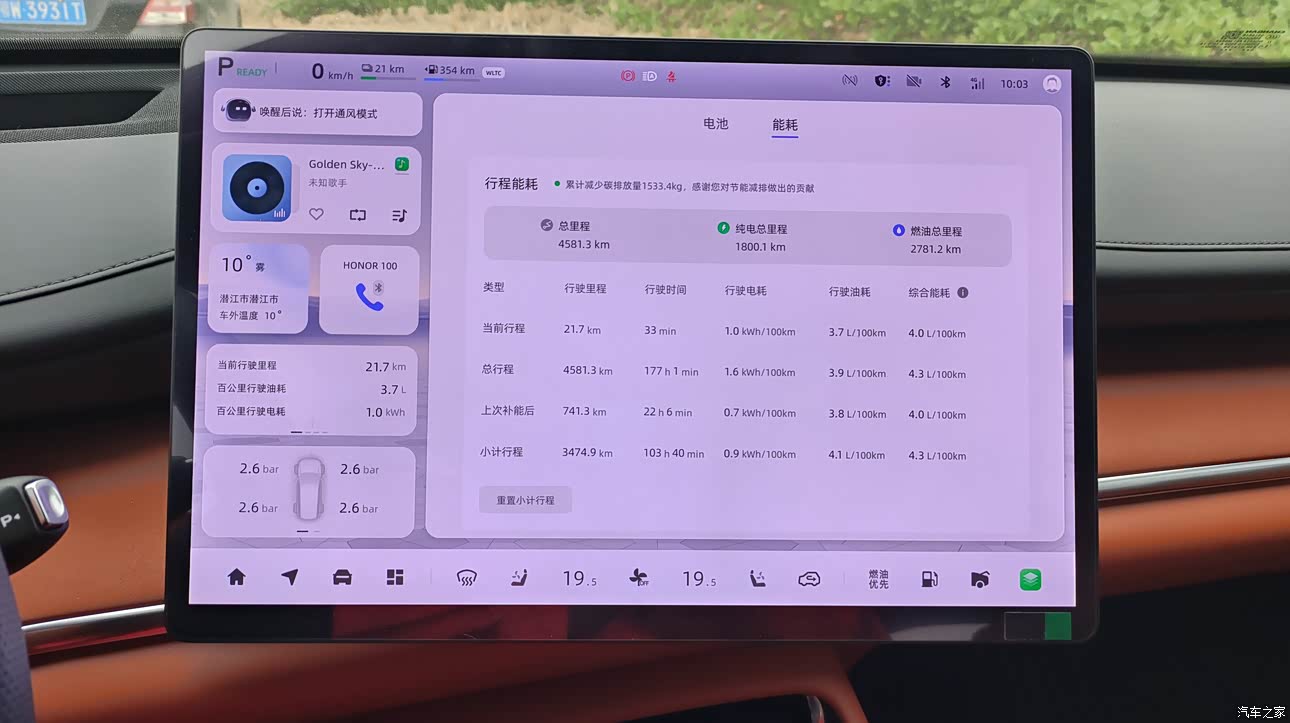 国庆节前满油(1200)满电(145)出发测试,一直用燃油优先,跑了945km,电剩11油还剩120,还算满意。现在为止跑了4580km,表显油耗为4.3L,非常不错。如果用纯电的话,还能降1L。每天50km通勤情况下,基本上20天充一次电,充一次油就够了。