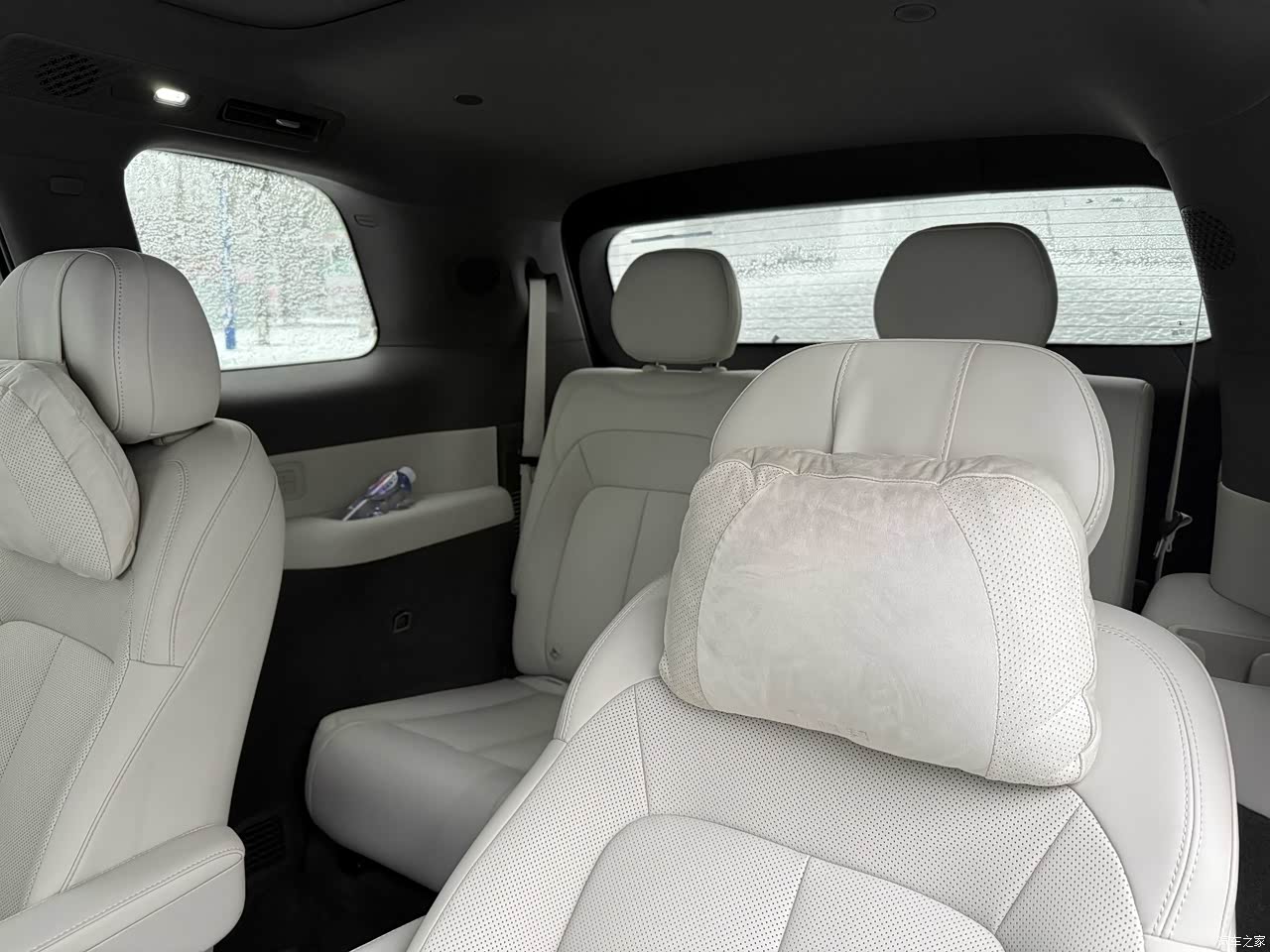 米色内饰冬天看着特别亮堂,不会像深色内饰那样压抑,而且材质耐脏性比我预想的好,孩子偶尔弄上点污渍,用湿布一擦就干净,座椅用料摸着很舒服,虽然不是真皮,但质感柔软,包裹性很好,坐久了也不觉得累。不过尊荣版的后排屏幕得选配,好在是质量不错,屏幕显示很清晰,PM2.5空气净化功能很实用,北京冬天空气质量不好,打开净化后,车里的空气很清新。