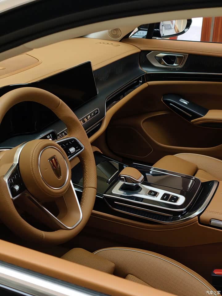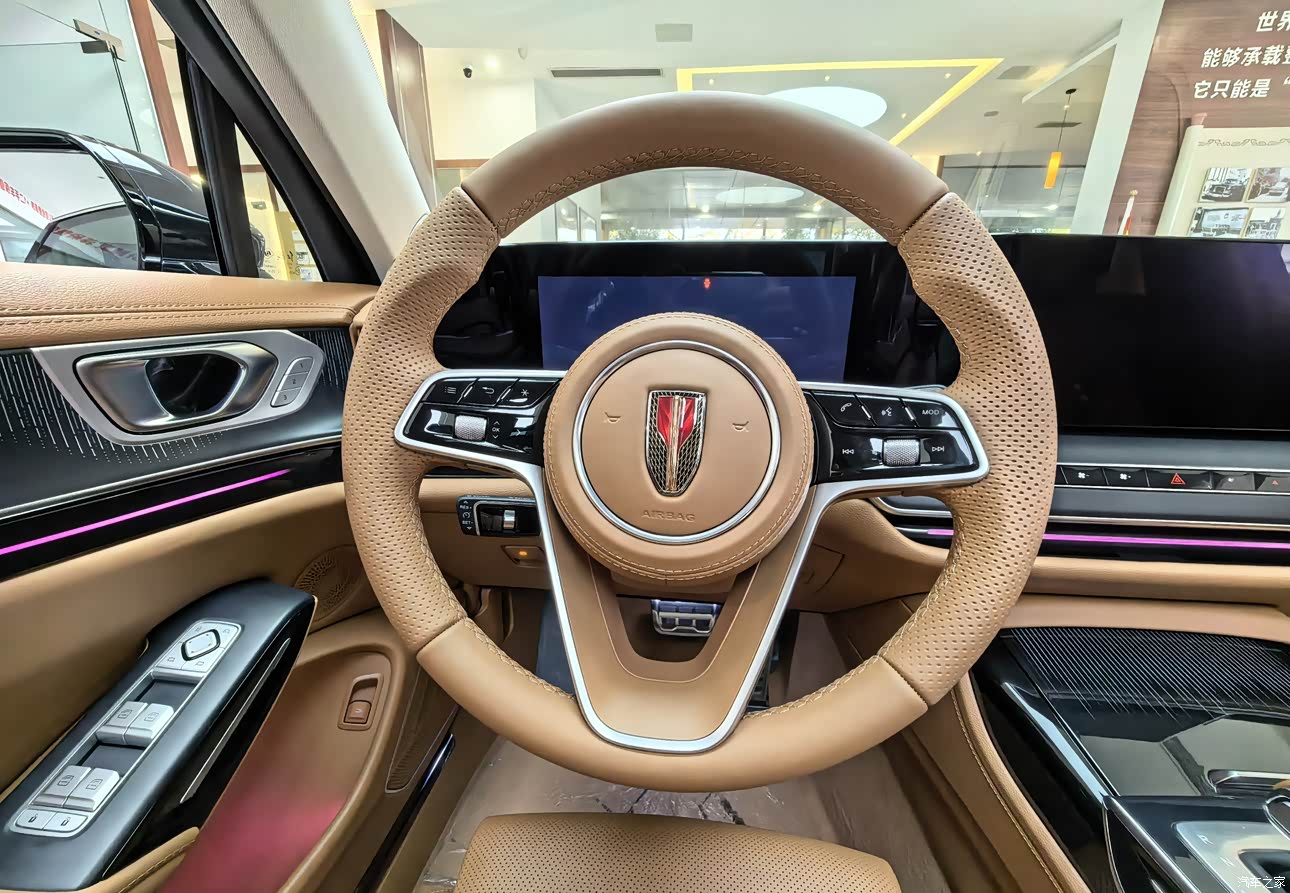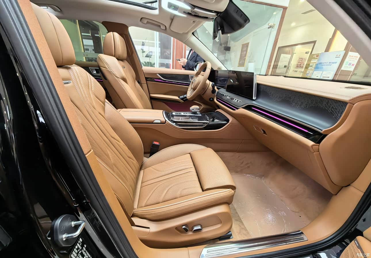 因为是静态体验,没能开上路,但从座椅和底盘的设计能感受到一些细节。座椅的包裹性很好,腰部支撑的调节幅度也够,能把身体牢牢托住,就算是长时间驾驶,腰部也不会觉得酸。方向盘的大小和粗细很合适,皮质的握感特别舒服,转向的虚位看起来不大,应该会比较精准。底盘方面,从悬挂的结构来看,调校偏向舒适性,过减速带或者坑洼路面的时候,应该能过滤掉大部分颠簸,后排的乘客体验会更好。不过因为车身尺寸比较大,操控上可能会少一点灵活感,毕竟这么大的车,主打还是舒适和稳重。