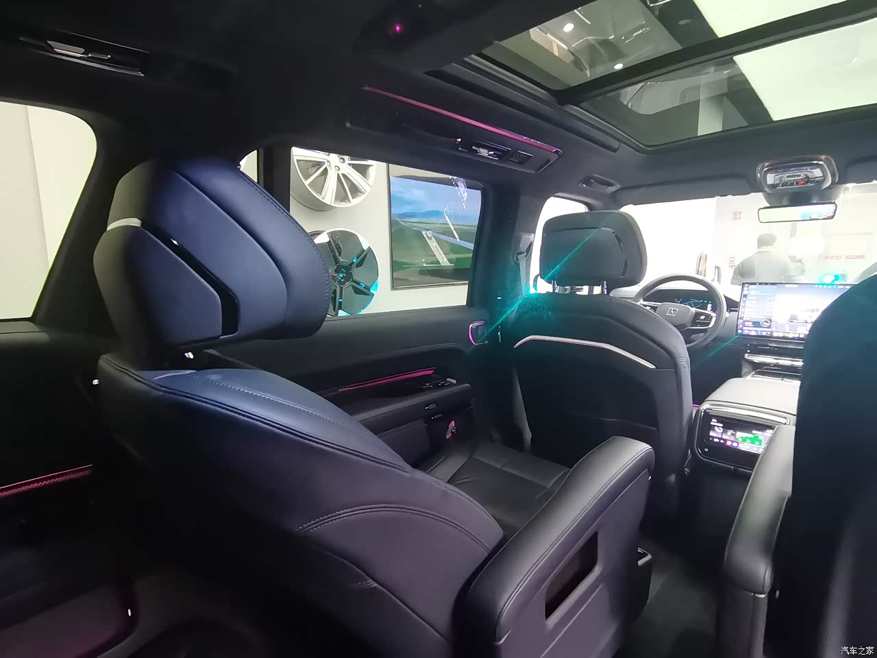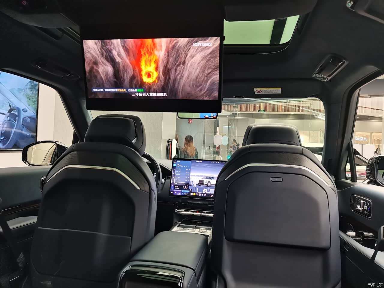 中控台是环抱式设计,有两个中控屏+HUD+仪表屏,很有科技感,在试驾的过程当中体验感也非常好,特别是HUD看得非常的清楚,而且它还可以投射出转弯时左右两侧的实时画面。后排头顶电视可以滑动,前后远近调节,以及角度调节。内饰豪华感足材质高级,车内是Soft NAPPA 真皮覆盖 + 细腻的缝线工艺,触感高级到不像这个价位该有的水准。