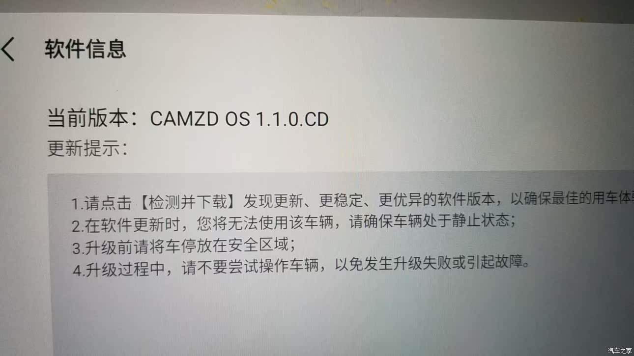 车机已经升级了一次,目前版本是CAMZD OS 1.1.0.CD,车主不能自行下载OTA更新,必须去4S店,给我造成不便,我距离4S有80公里。