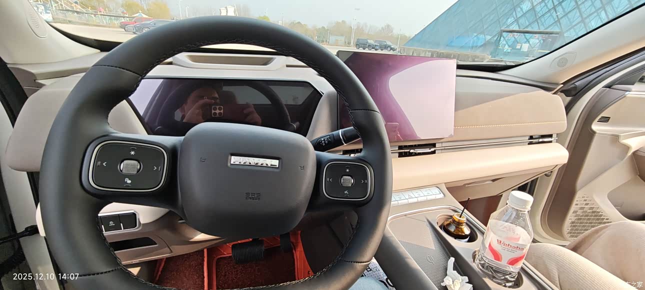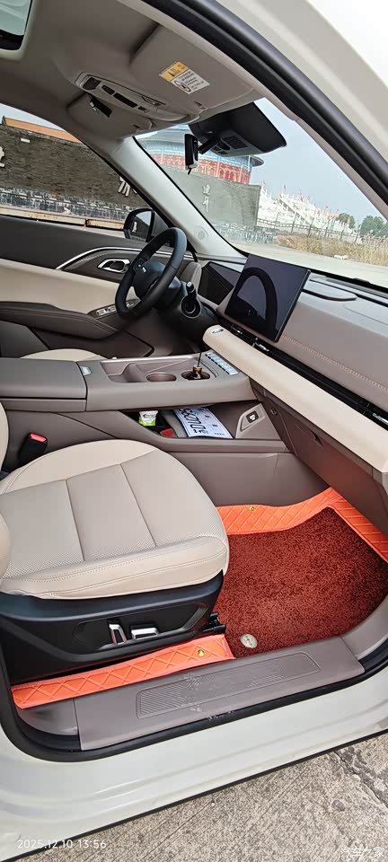 内饰用料扎实,经常接触的地方都是软质包裹,触感舒适。12.3 英寸液晶仪表和 14.6 英寸中控屏显示清晰,布局合理。略显遗憾的是中控屏边框略宽,视觉上不够精致,而且浅色内饰容易沾染指纹和灰尘,需要频繁擦拭才能保持整洁
