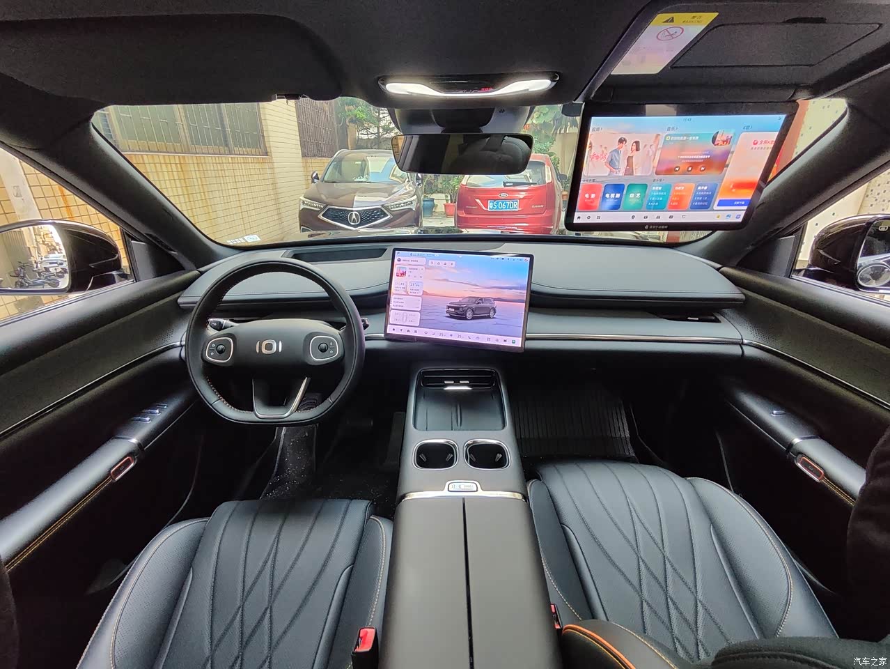 内饰选的黑色,虽然白色更显高级,但黑色更耐造。车内软包地方多,设计简洁,打开氛围灯后感觉很温馨。前后排均带坐椅通风加热,零重力女王副驾搭配折叠屏,女主拍手叫好。个人觉得如果能换上金属喇叭罩这类细节会更精致。