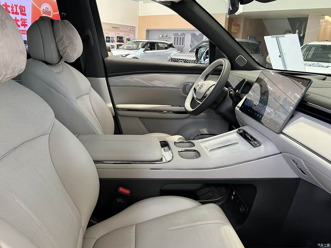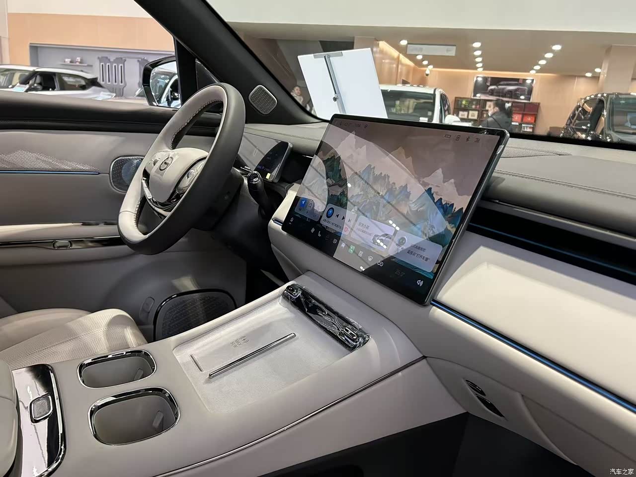 进入车内的第一感觉就是档次感很足,用料看着挺厚道,很多地方都是真皮和软质材料,摸起来挺舒服,真皮方向盘的造型我也喜欢,挺有运动感的,设计的还很饱满,开车时很有手感,转向也挺精准。屏幕的尺寸很大,只要一句你好小祺,就可以通过语音来控制很多功能, 开空调、车窗啥的也就是动动嘴的事,座椅按摩也可以,一句指令就可以开始按摩,真挺舒服的,车机用起来很流畅,后排还有液晶屏,出远门也不会觉得沉闷。